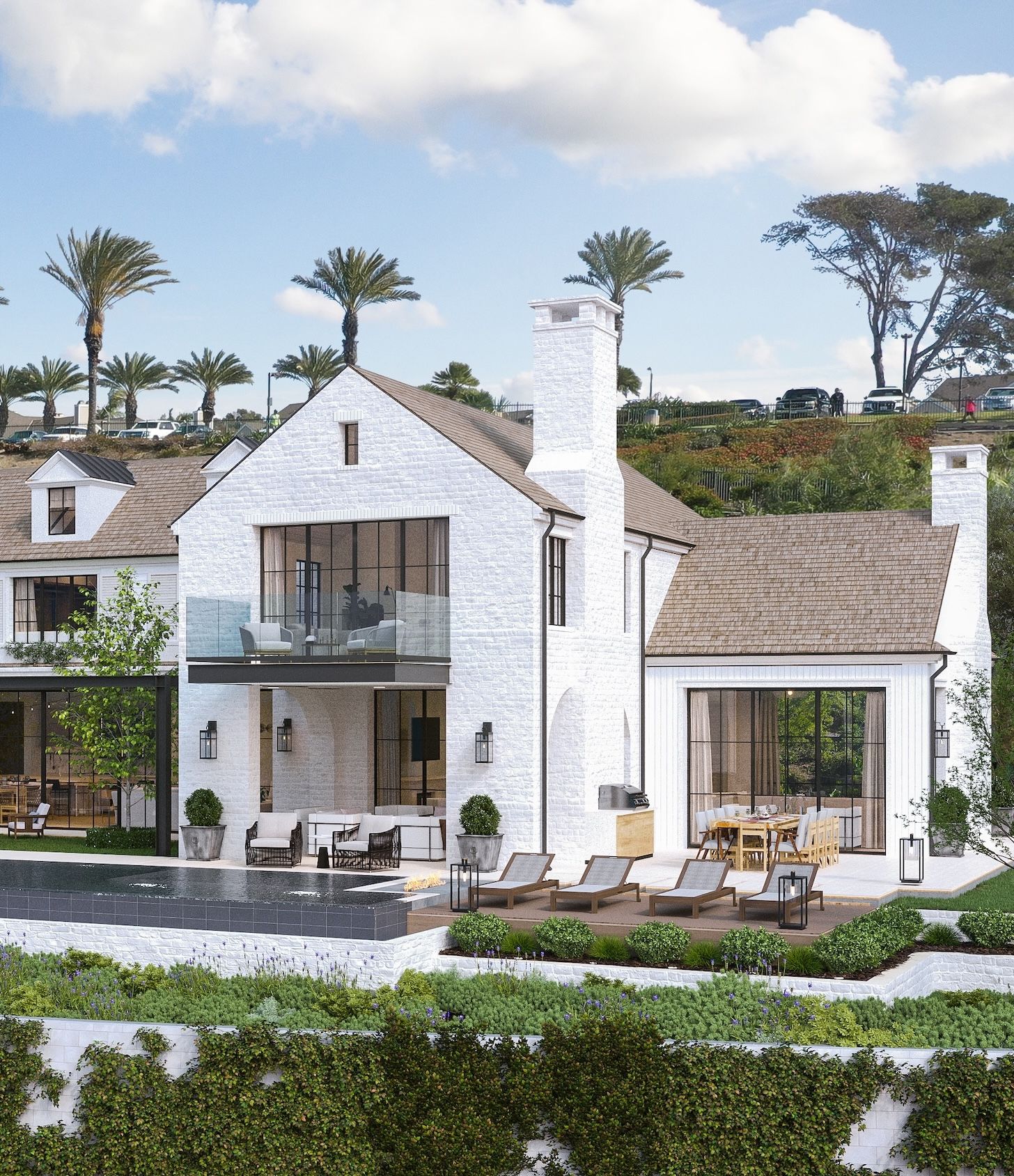 The Details: Conceived as a transitional California beach cottage, the home balances relaxed coastal ease with a refined sensibility, creating seamless movement between indoor living areas and generous exterior terraces, a waterfall pool, and lounging spaces.