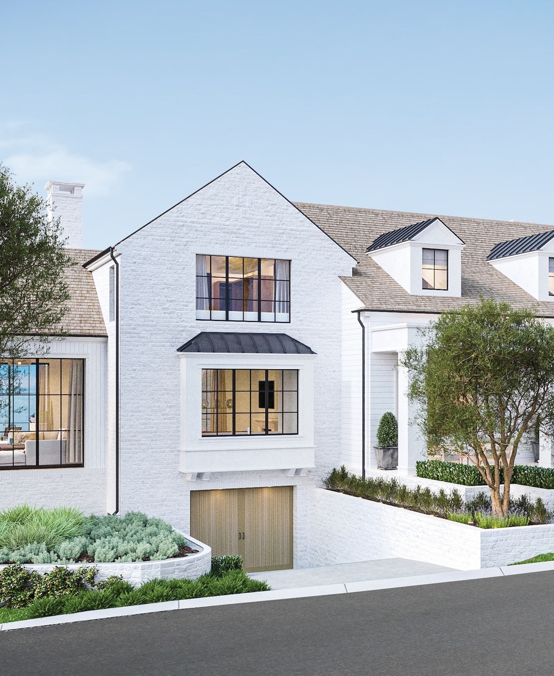 The Materials: White-washed brick and horizontal clapboard siding establish a timeless coastal character, complemented by steel doors and windows and natural wood accents for a contemporary polish that still feels warm, lived-in, and distinctly at home by the sea.