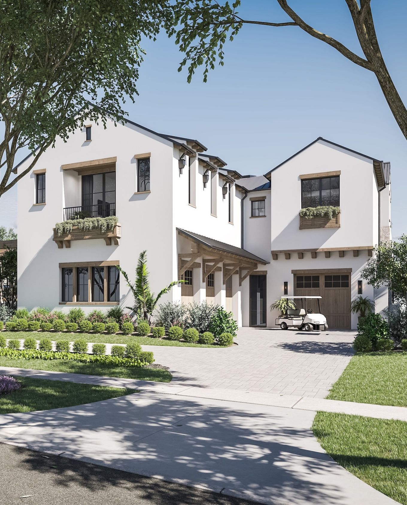 The Materials: Smooth-coat stucco and natural stone form the primary surfaces, complemented by stained-grade wood and a standing-seam metal roof, creating a palette that balances warmth, texture and Southwest Florida modernity.