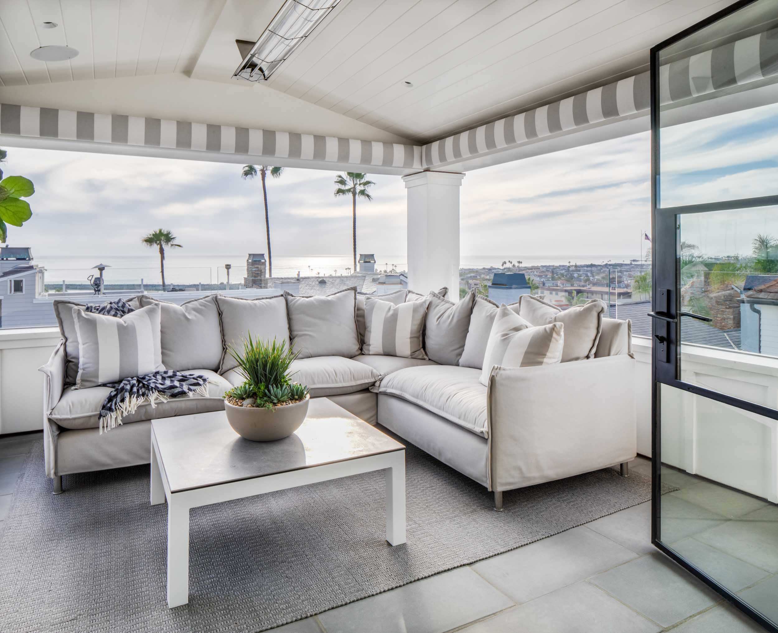 The top roof top deck takes full advantage of the panoramic views of the jetty beach and corona del mar.