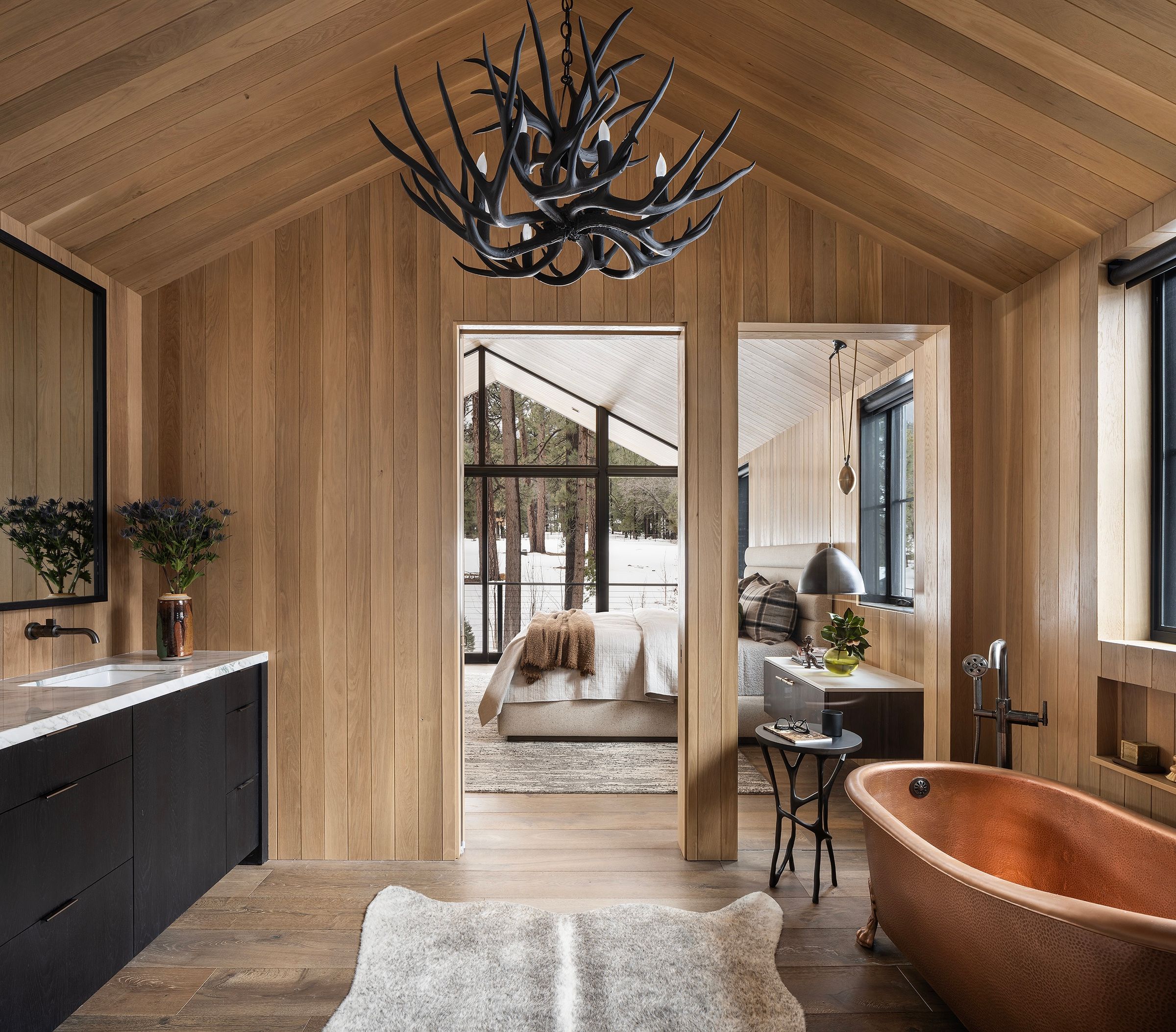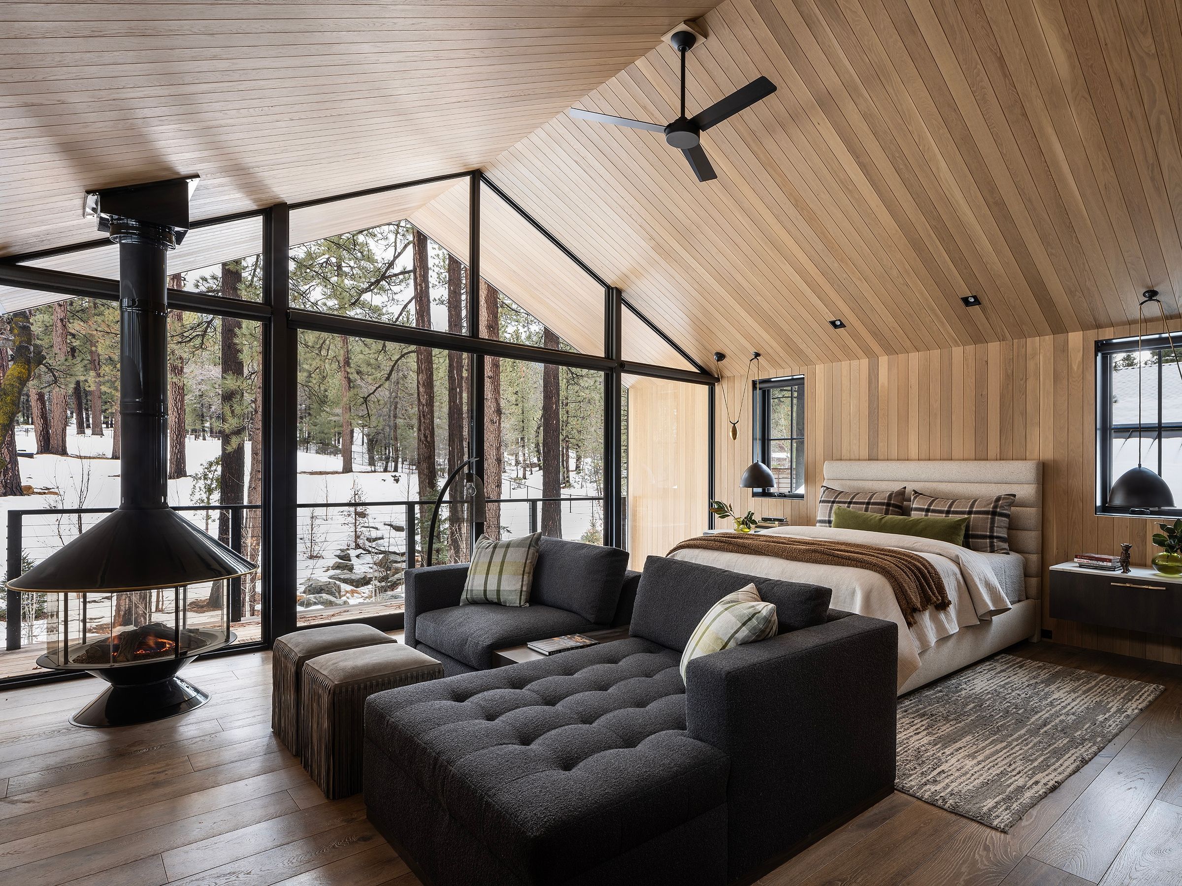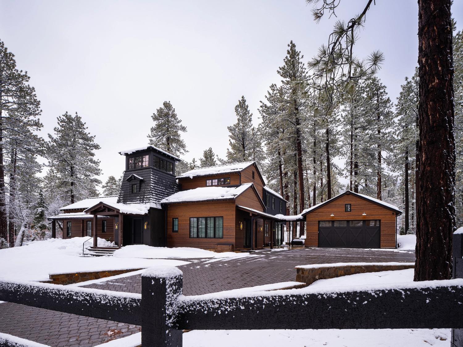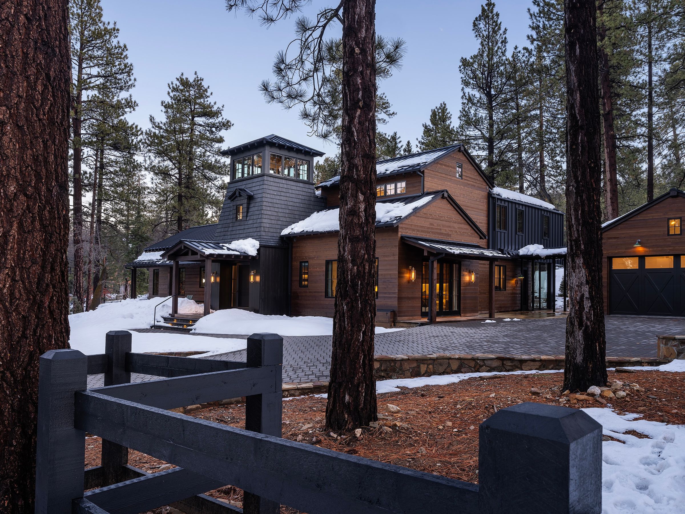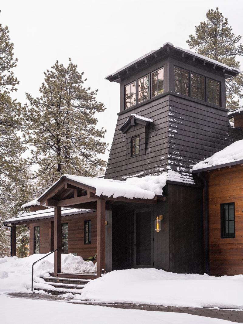 A 1926 fox tower is reimagined as an après-ski compound comprising a primary residence, two cabins, and a glass pavilion.