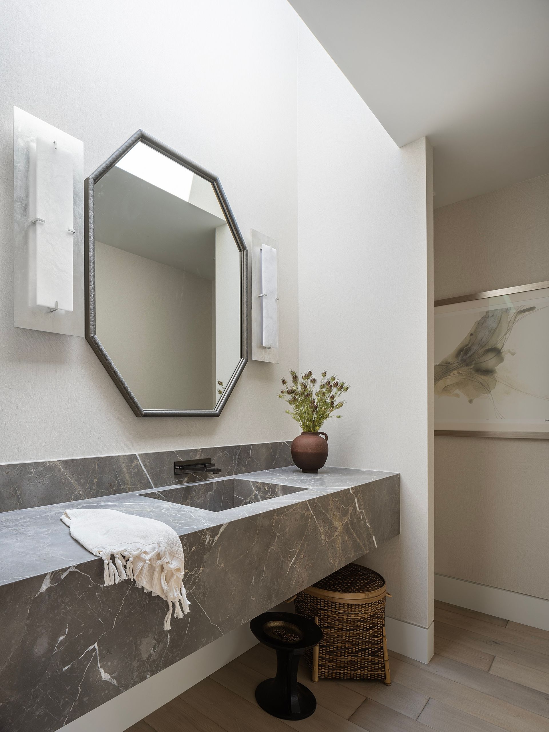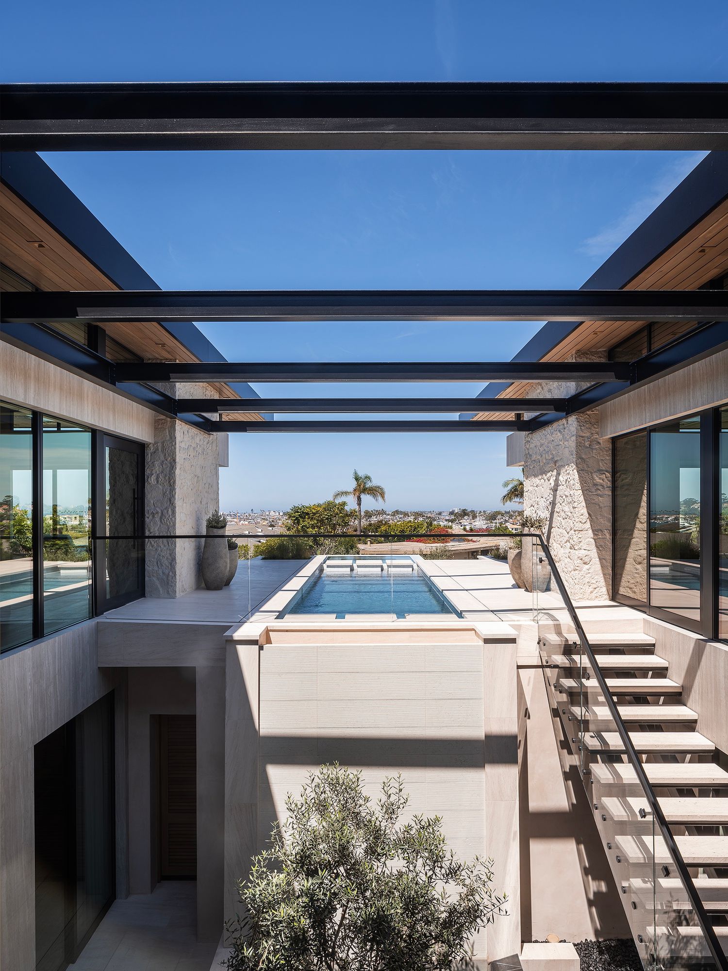Designing a typical basement for this home in the Irvine Terrace neighborhood of Newport Beach simply wouldn't do. Instead, we doubled the volume of this one-story home with plenty of wow factor by creating a central courtyard that divides the home into two living wings. The courtyard features a long, linear pool that waterfalls over 12 feet below into a reflecting pool at the basement level, and a central outdoor living area provides expansive views overlooking the courtyard to the Pacific Ocean beyond. The home’s composition maximizes natural light through clerestory glazing, pocketing doors, and floor-to-ceiling feature windows, while differentiated rooflines give character to each wing and articulate programmatic zones.