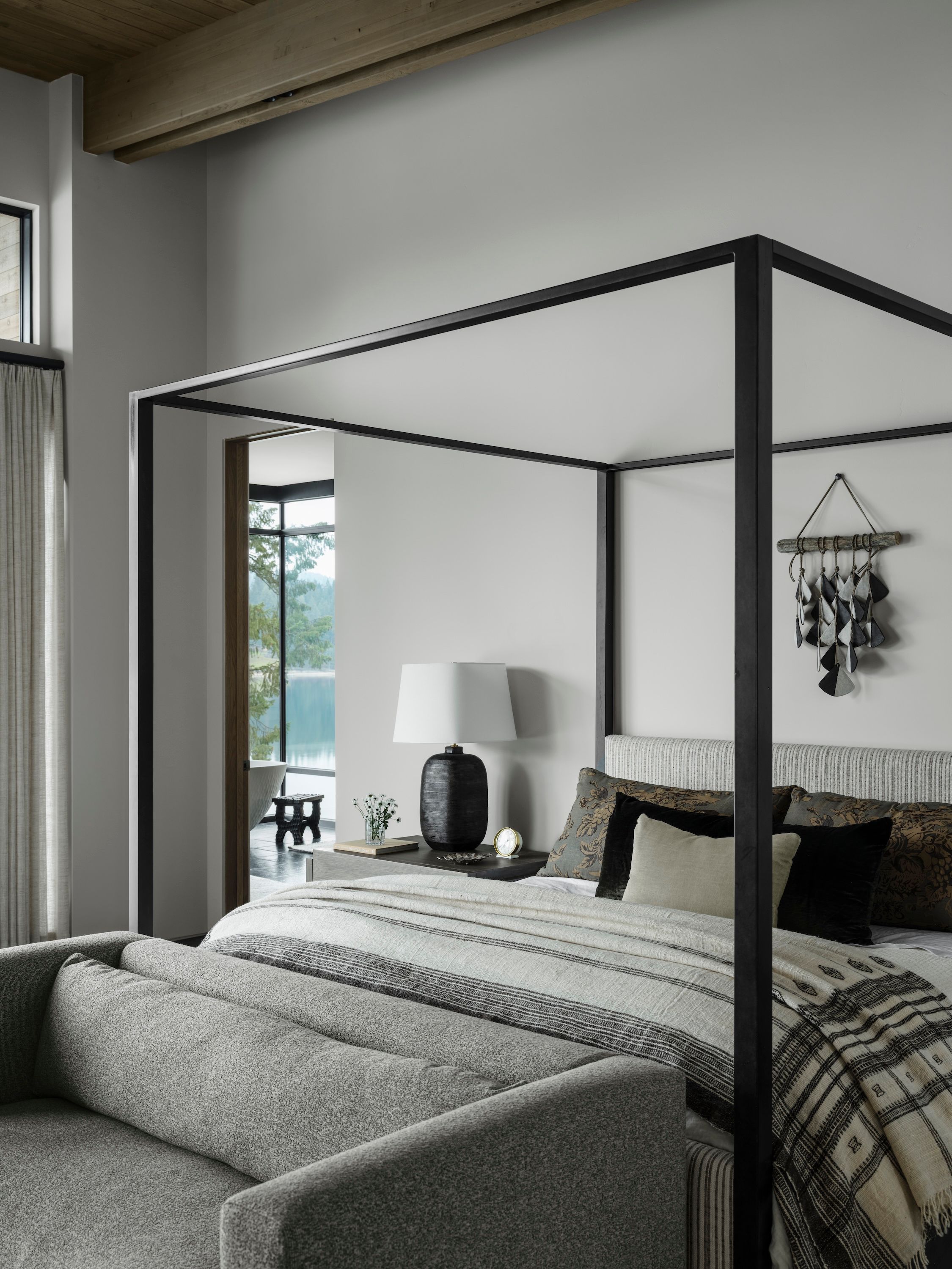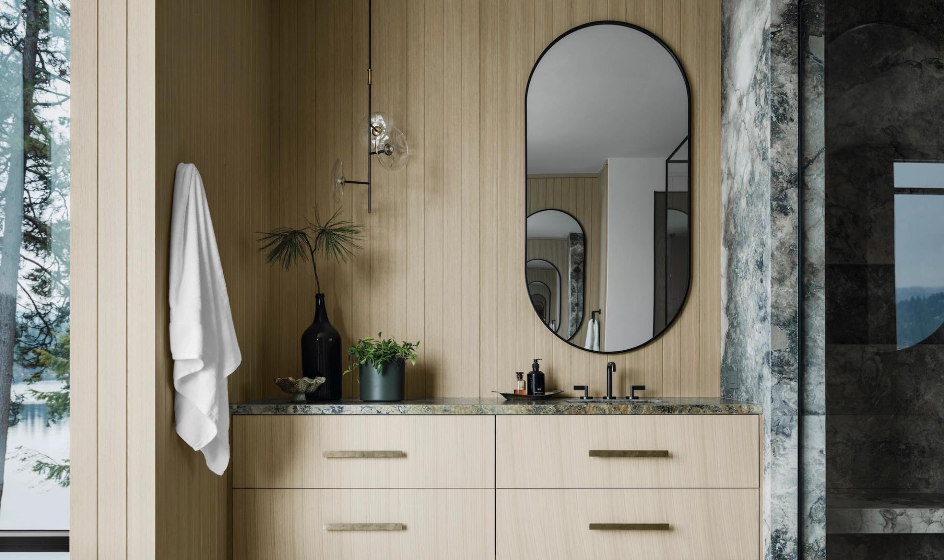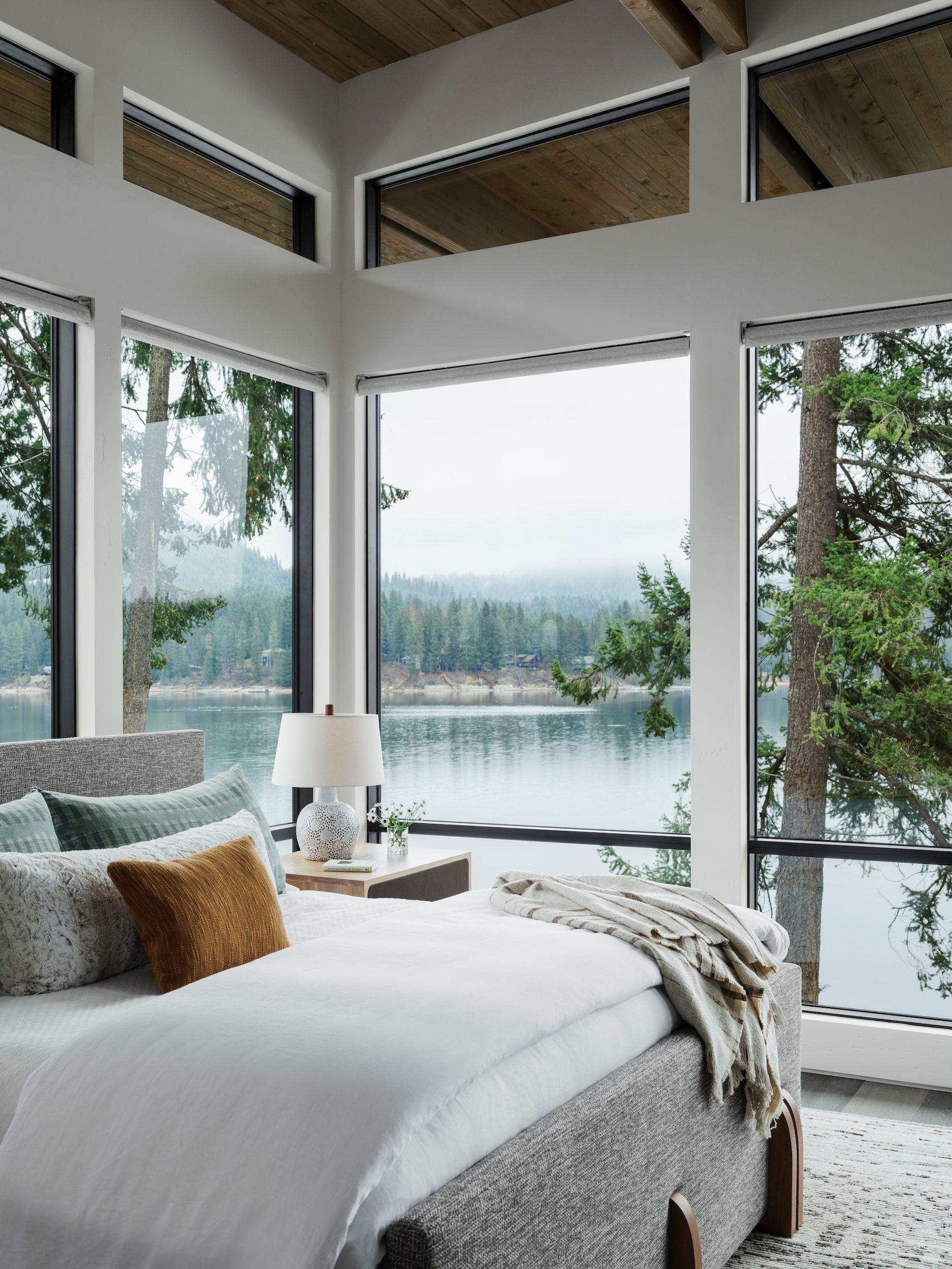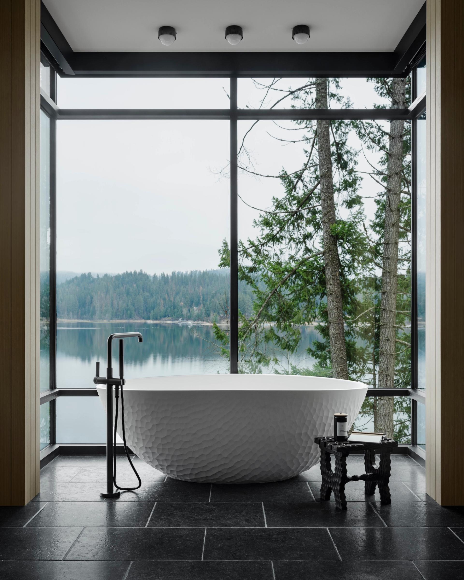 Morrison’s design ethos of tension informs every interior detail. Earth-toned palettes of terra cotta, sage, olive, and black echo the surrounding landscape, while textures, materials and furnishings are selected for comfort, style and a narrative that reflects family life. Expansive glazing and open gathering spaces allow the lake and forest to remain a constant backdrop, connecting interior spaces seamlessly with the outdoors.