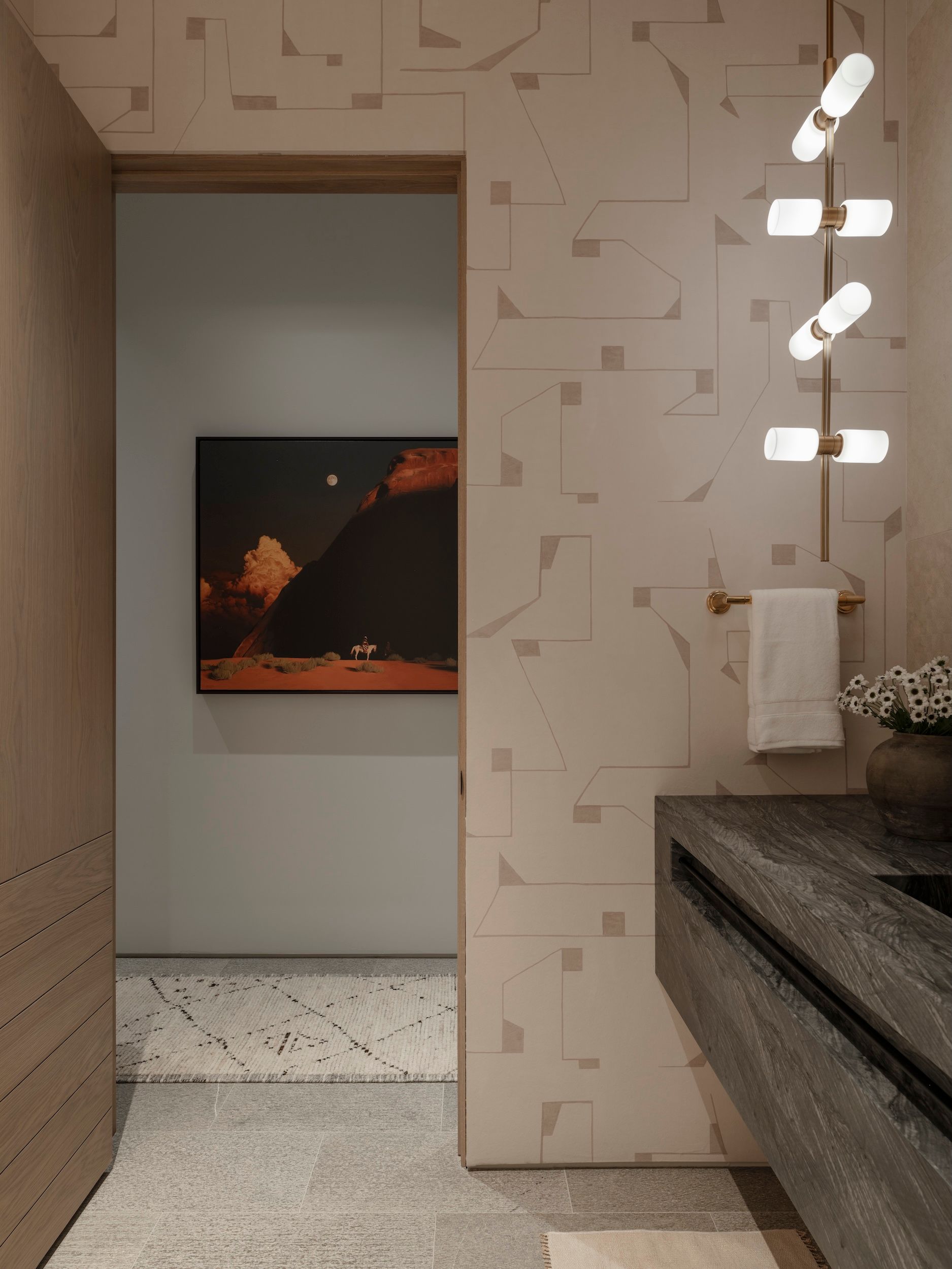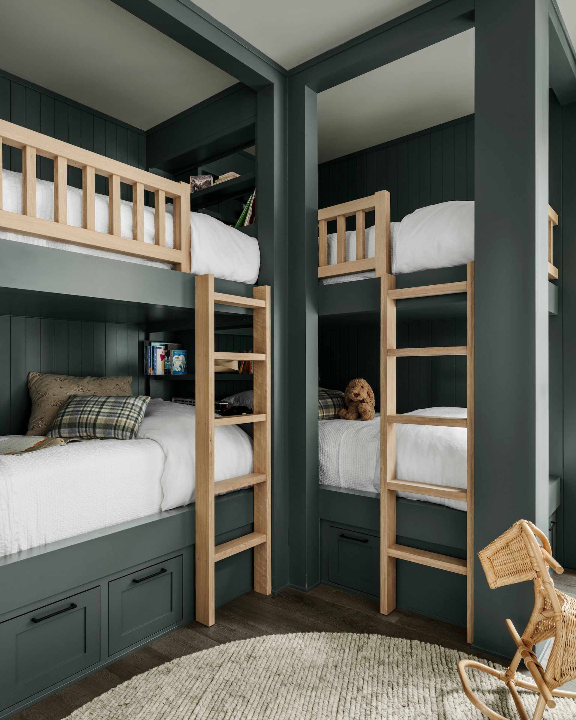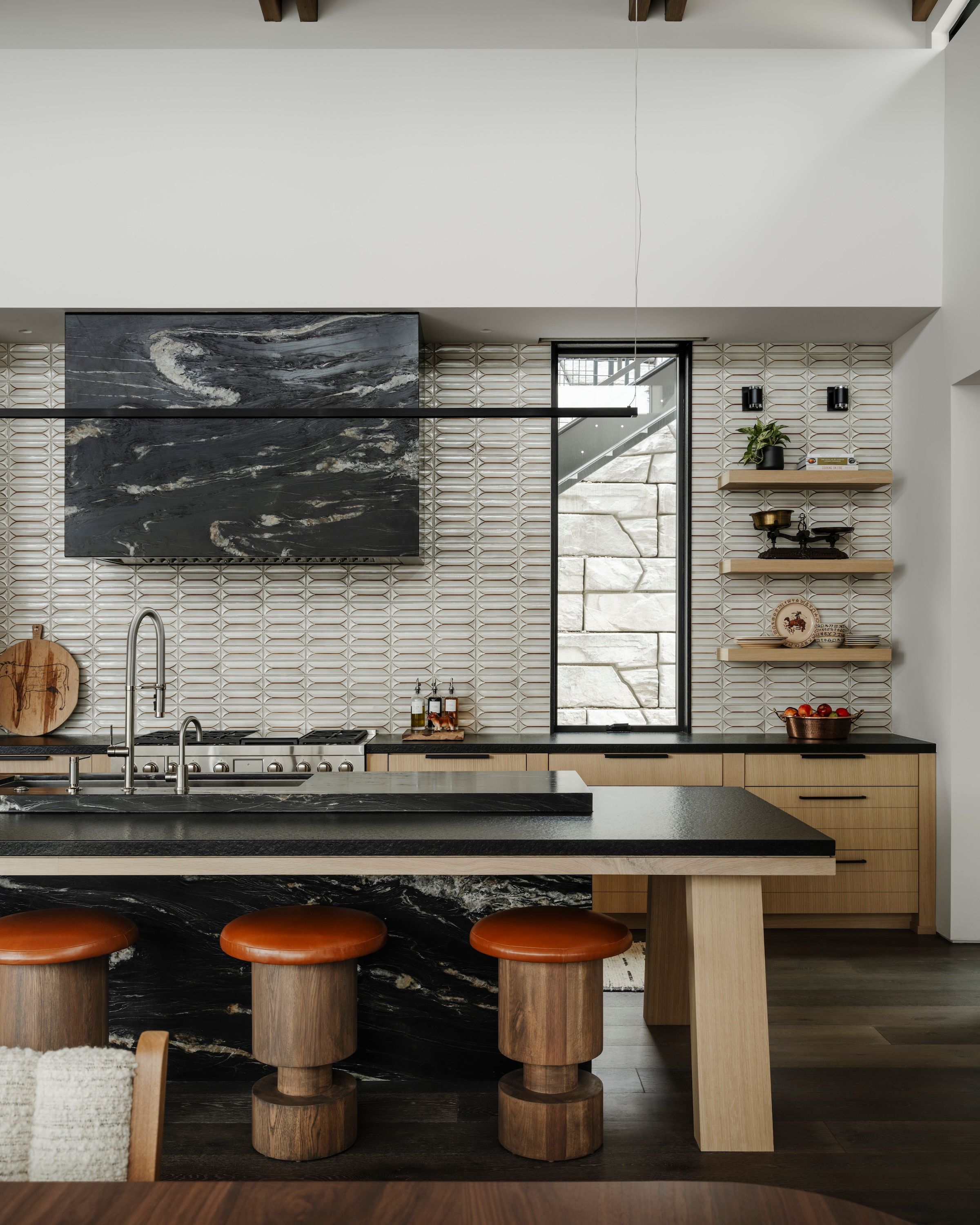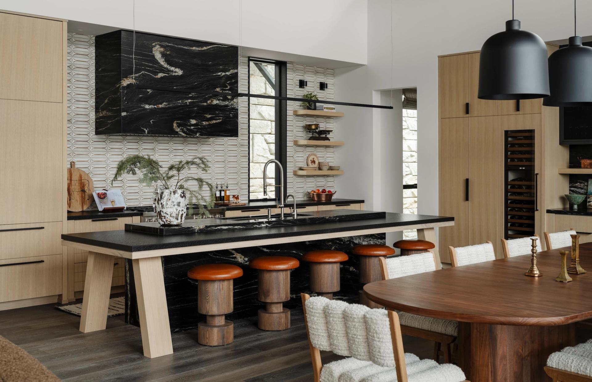 Morrison’s design ethos of tension informs every interior detail. Earth-toned palettes of terra cotta, sage, olive, and black echo the surrounding landscape, while textures, materials and furnishings are selected for comfort, style and a narrative that reflects family life. Expansive glazing and open gathering spaces allow the lake and forest to remain a constant backdrop, connecting interior spaces seamlessly with the outdoors.
