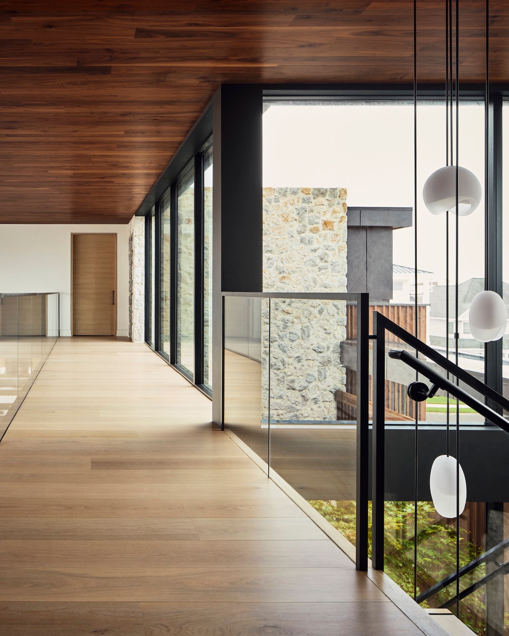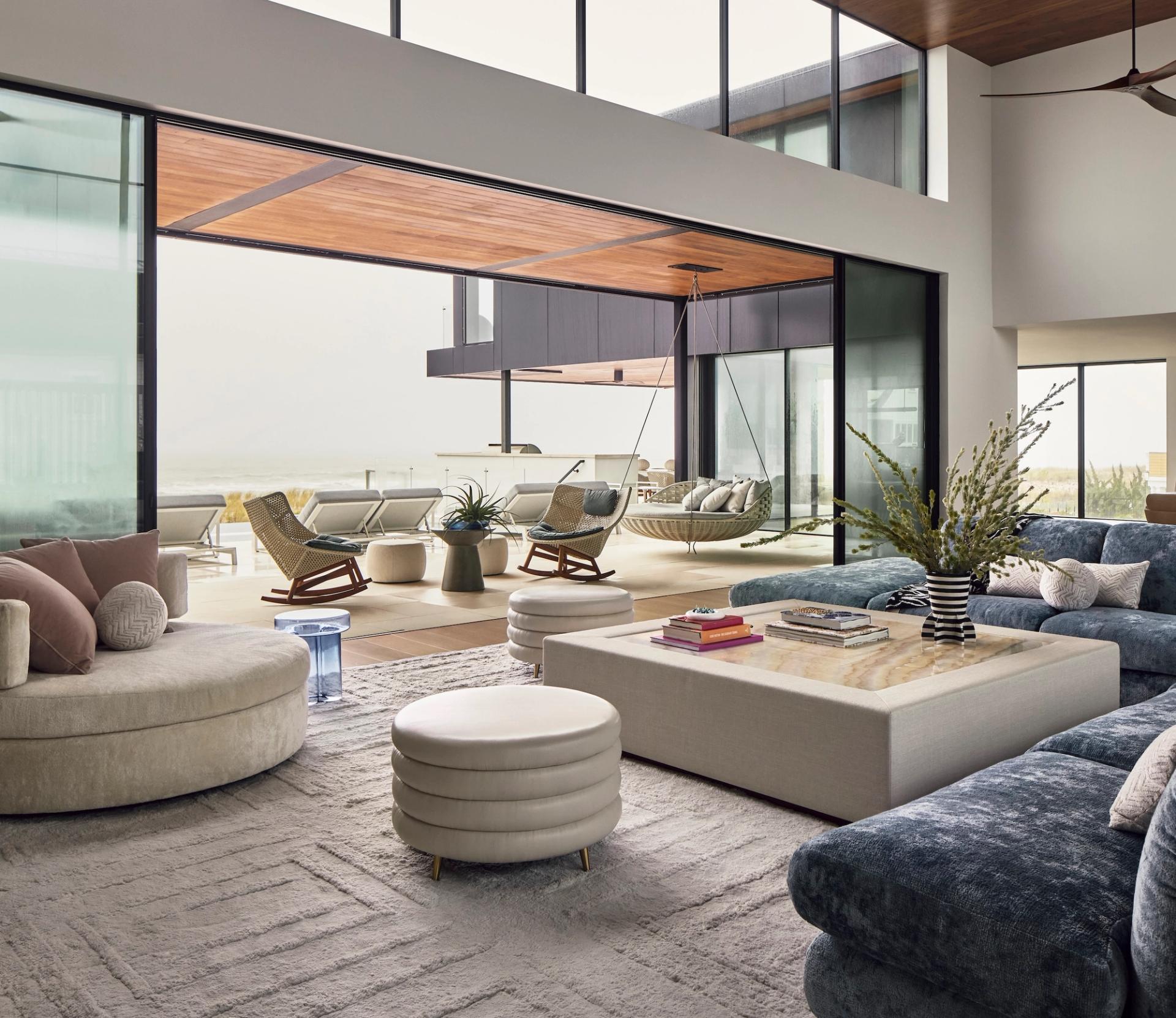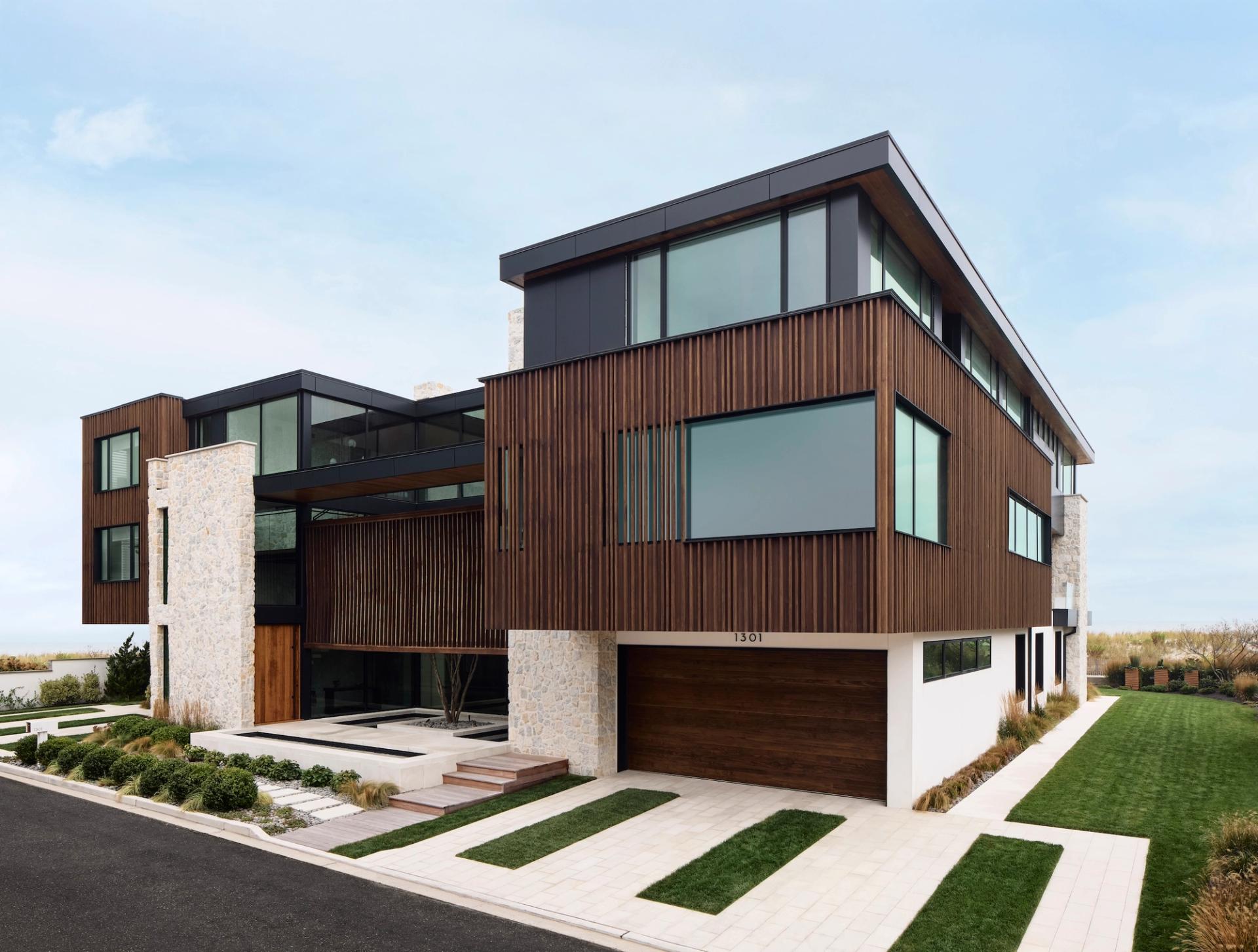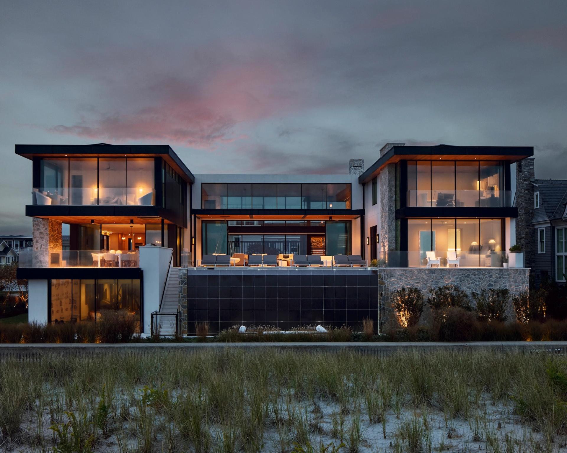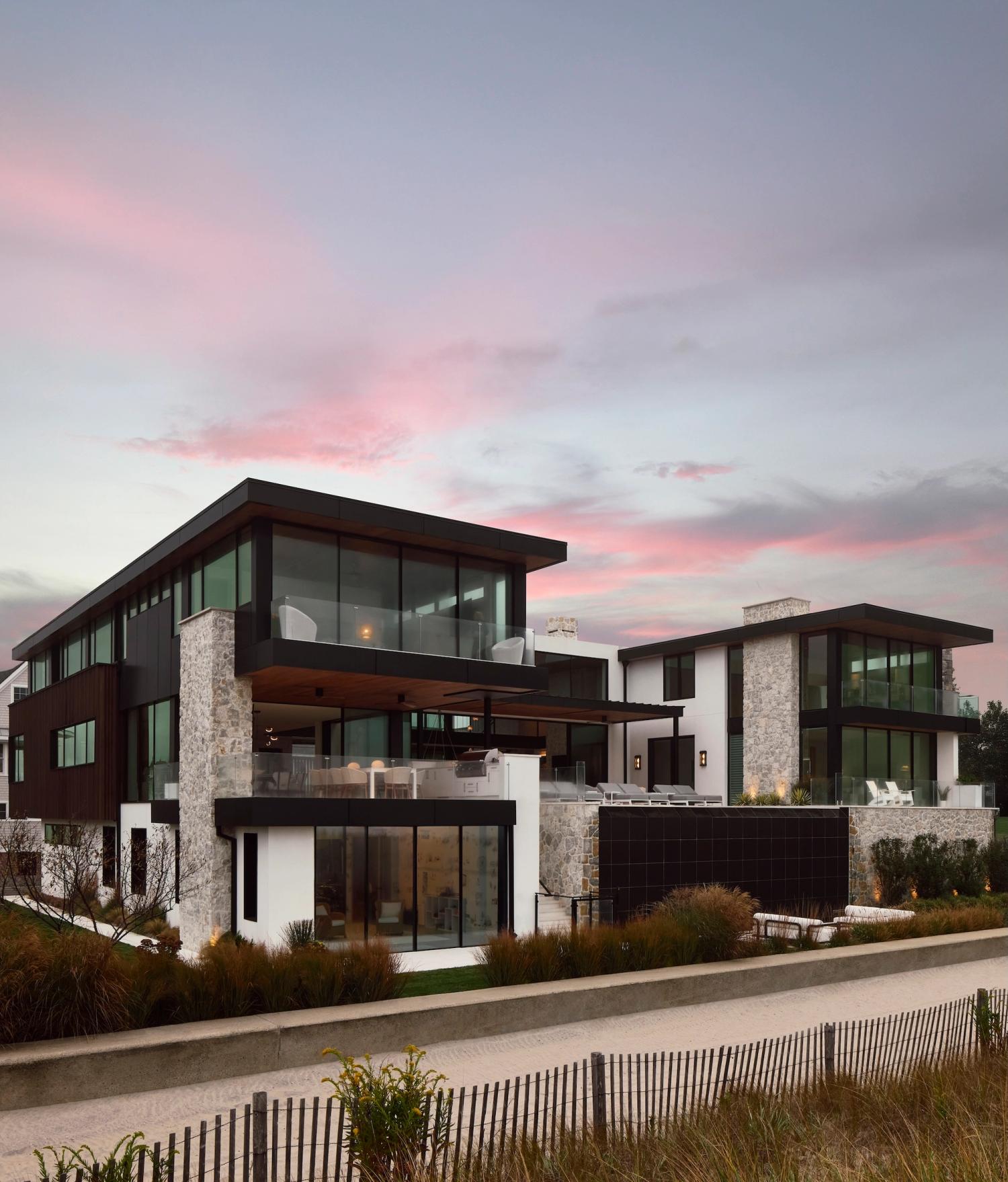 After Hurricane Sandy, new FEMA-mandated dunes protected the coastline but blocked once-expansive views to the Atlantic. This home responds by elevating the primary living spaces above flood levels, reclaiming the horizon and restoring the visual relationship between architecture and ocean. Designed for a large, close-knit family, the home centers on a dramatic two-story great room where living, dining, and kitchen spaces flow together and open to generous terraces. Floor-to-ceiling glass frames the shoreline and brings daylight deep into the interior, creating seamless transitions between indoors and out. Secondary and private spaces are distributed across the upper levels to maximize views, while the entry and ground-level spaces are designed for coastal flood compliance. The exterior is distinguished by a mix of stucco, natural stone and slatted wood elements, offering warmth, durability, and textural depth suited to the marine environment. Layered volumes and varied rooflines soften the massing and create a home that feels welcoming, refined, and connected to its setting.