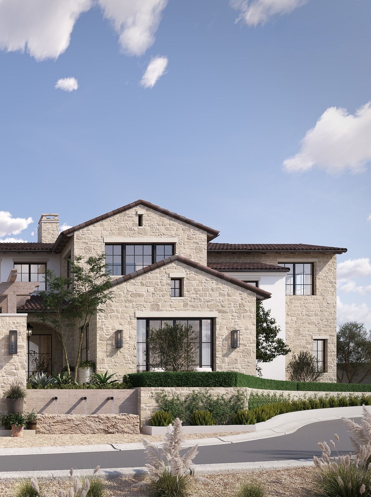 The Materials: Smooth-coat stucco, stone, warm wood accents, and a traditional Spanish clay tile roof create a palette that speaks to a sense of place within a contemporary Mexican context.