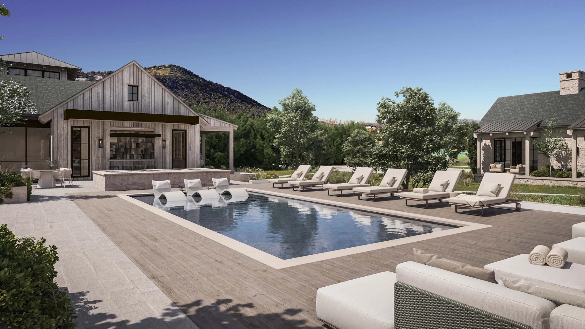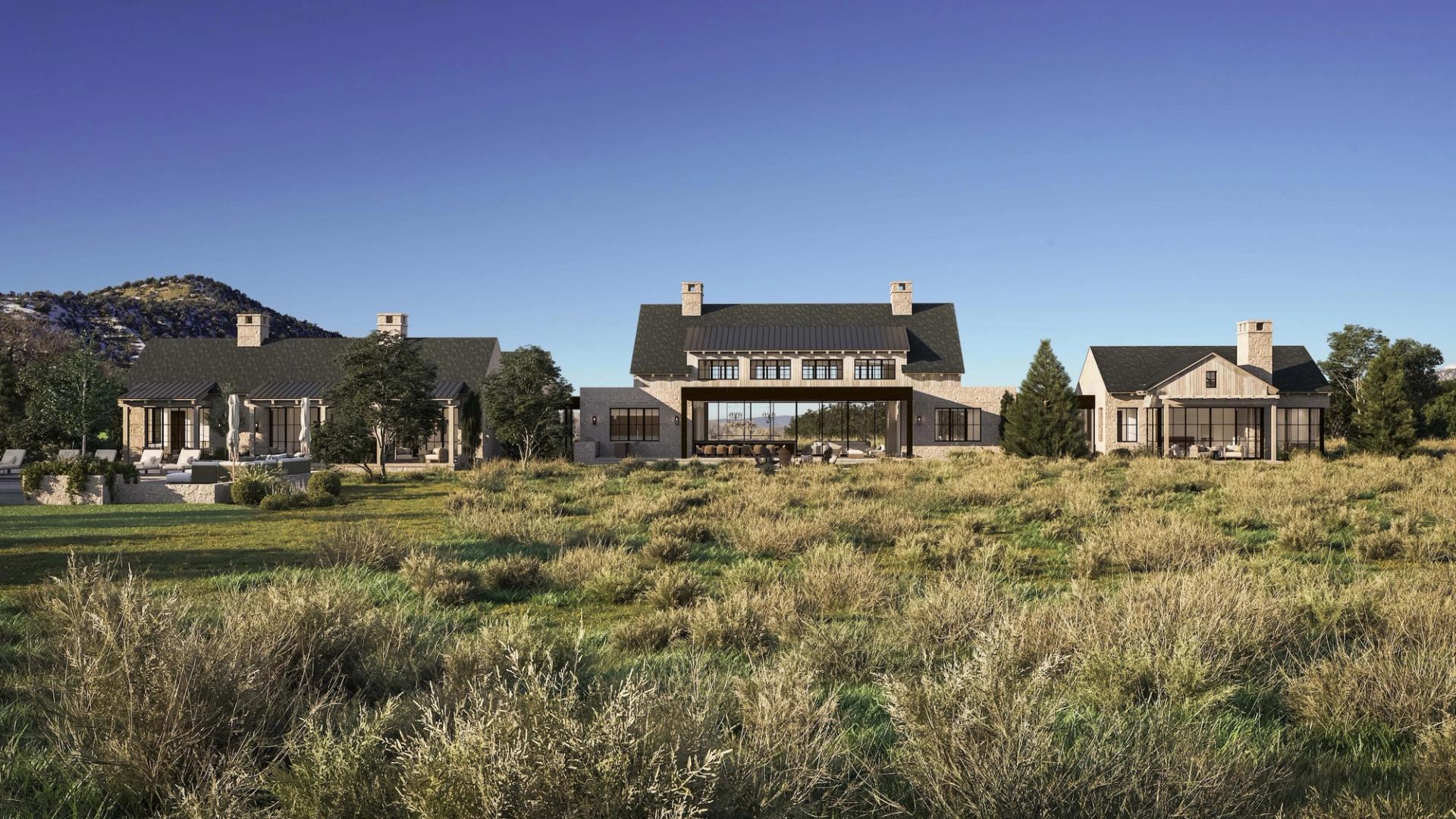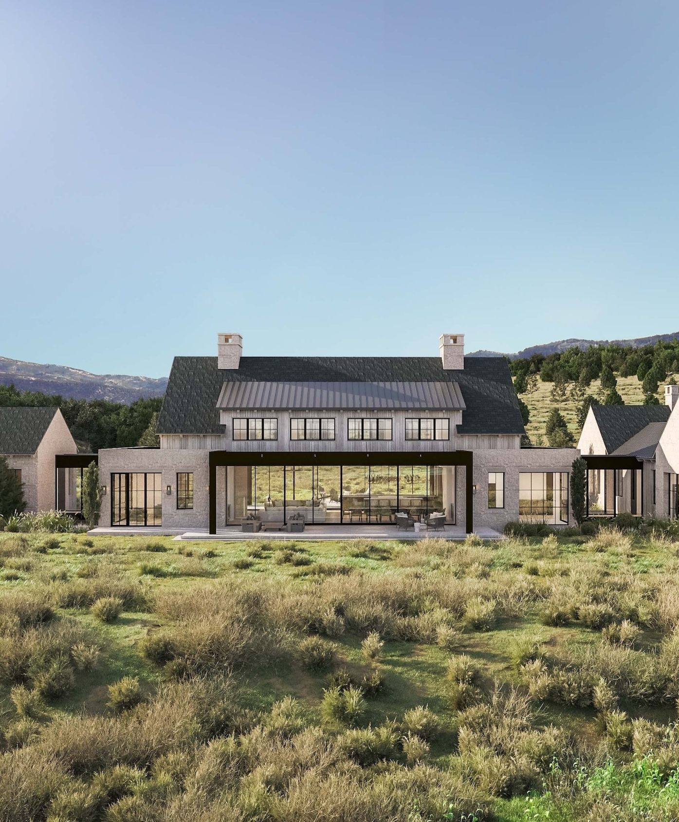The Materials: Natural stone veneer, vertical siding, metal accents, and reclaimed wood ground the architecture in authenticity, reinforcing a sense of permanence and heritage across the expansive landscape.