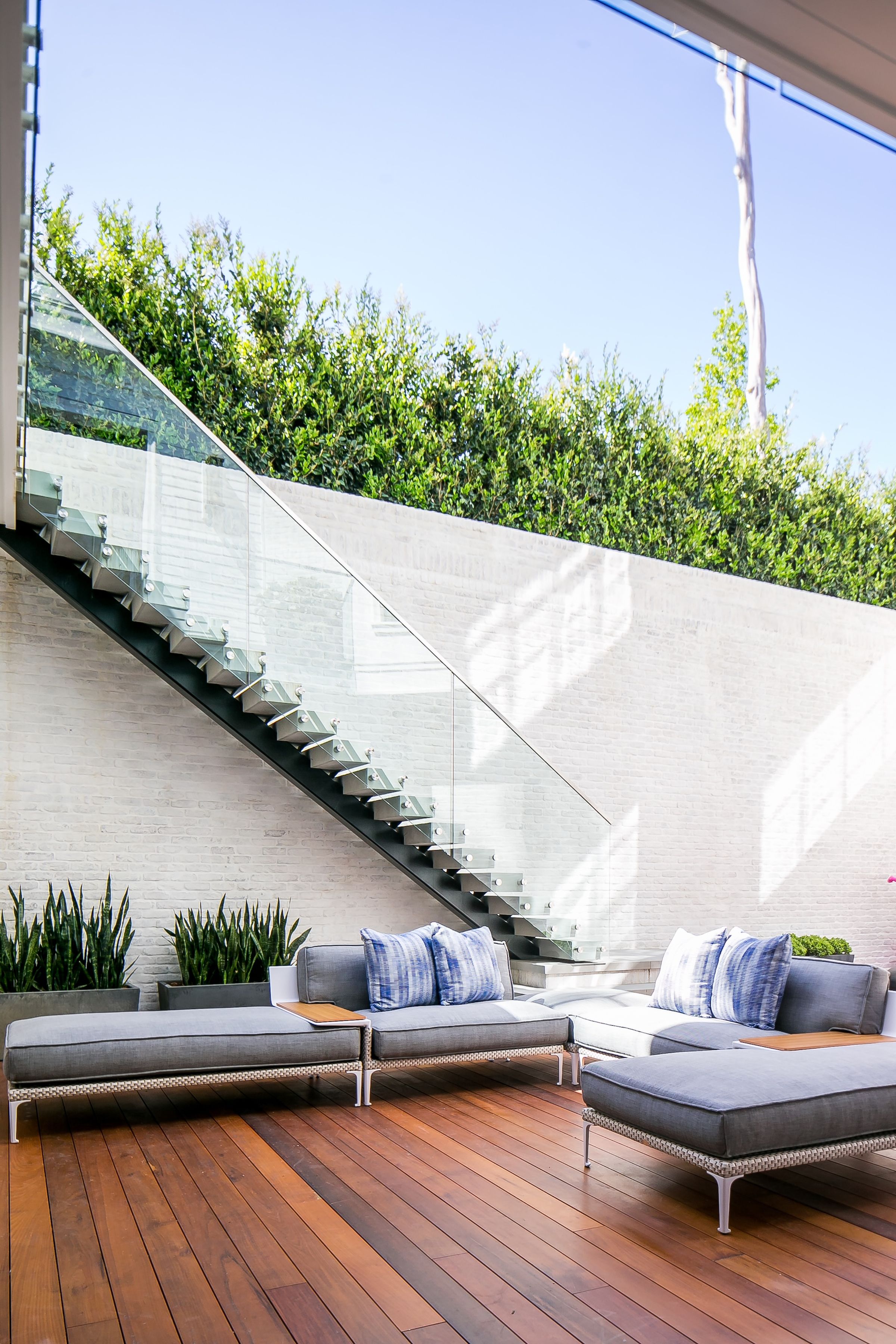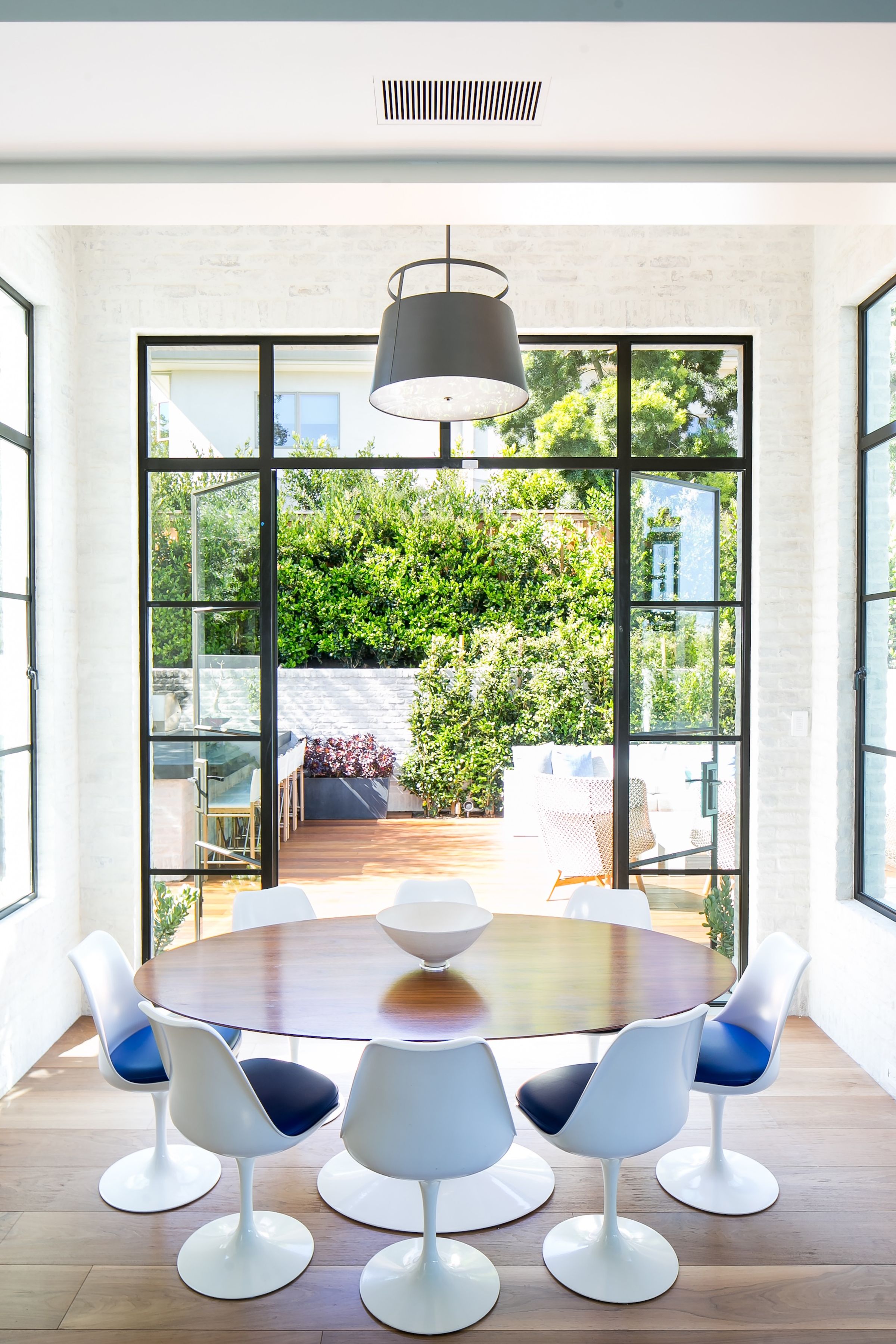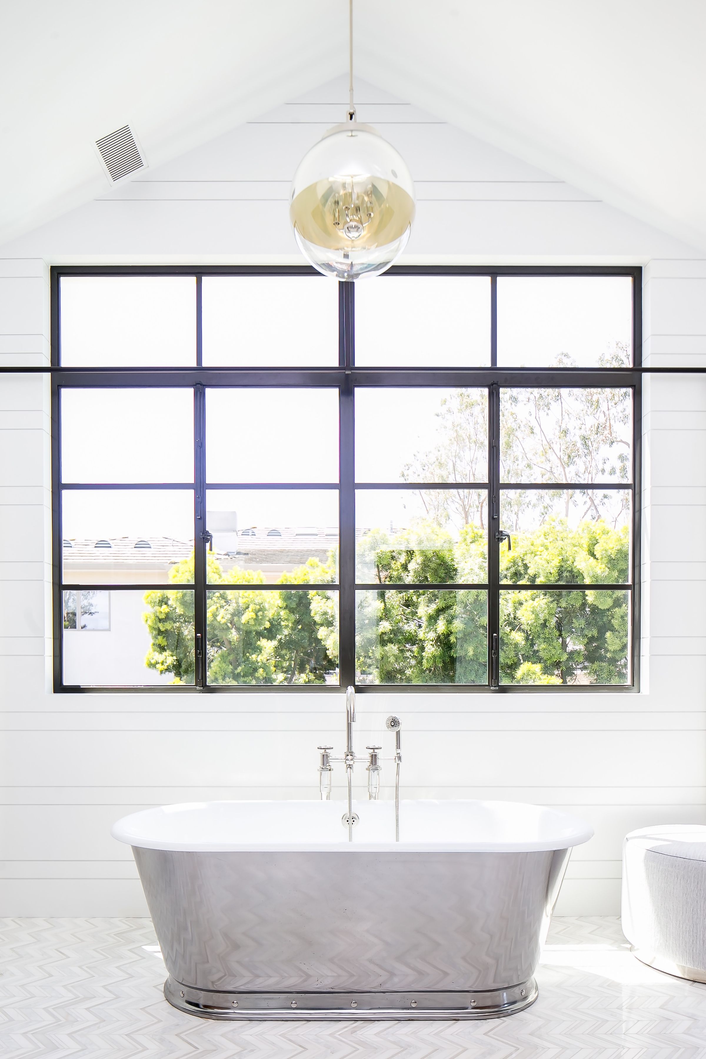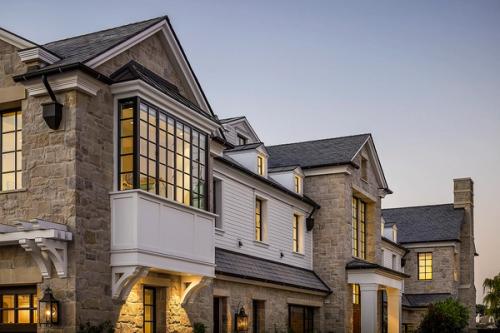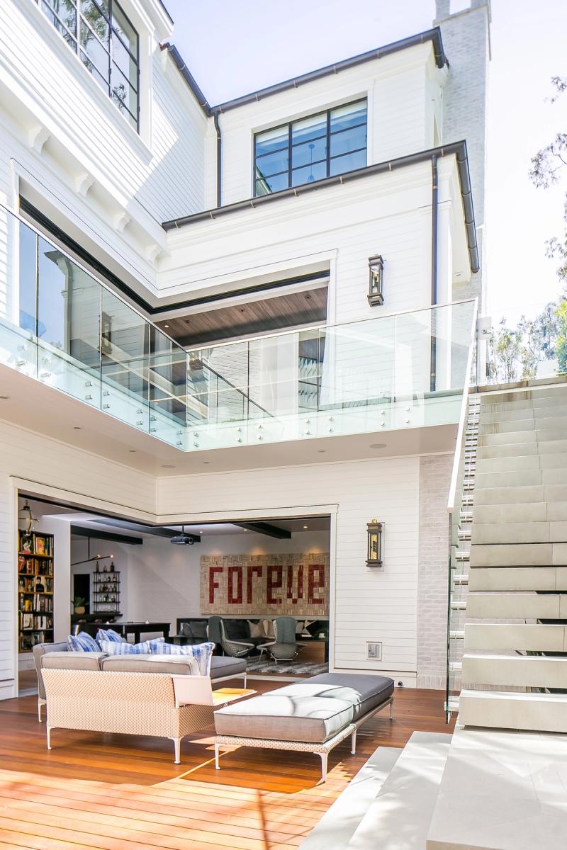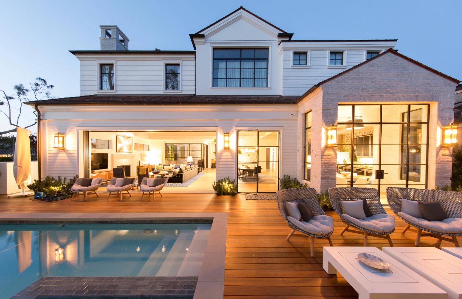Hollywood Regency reimagined in clapboard siding, limewashed brick and steel.