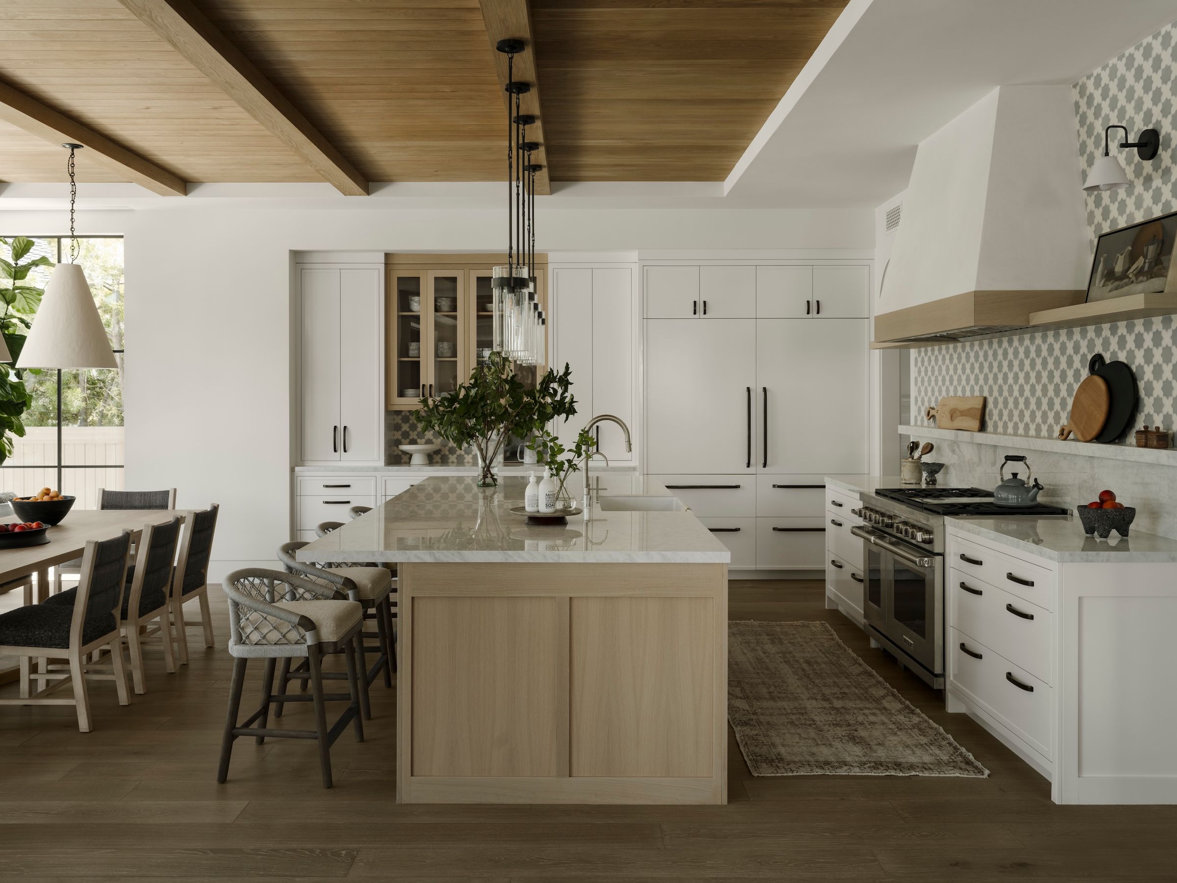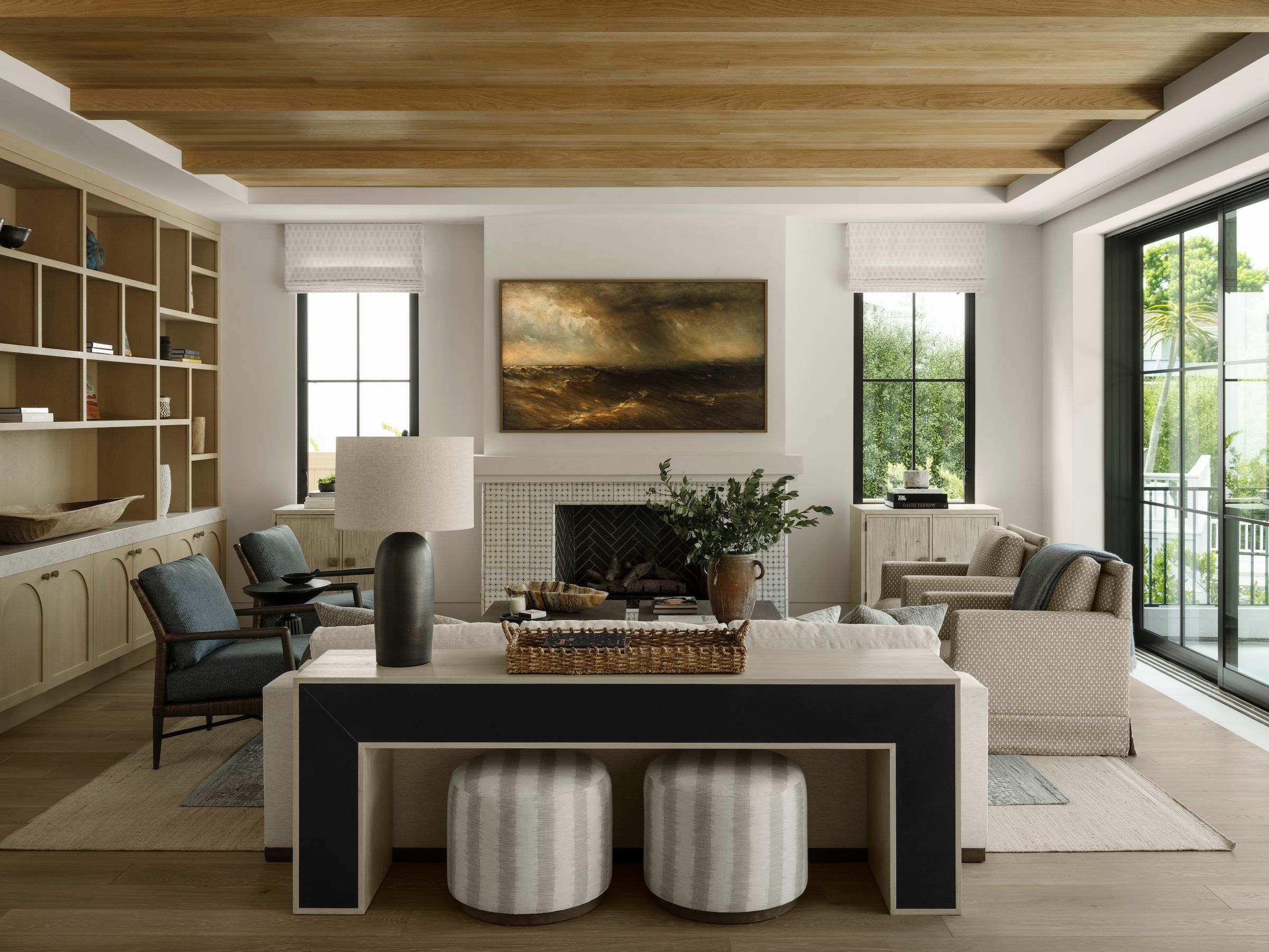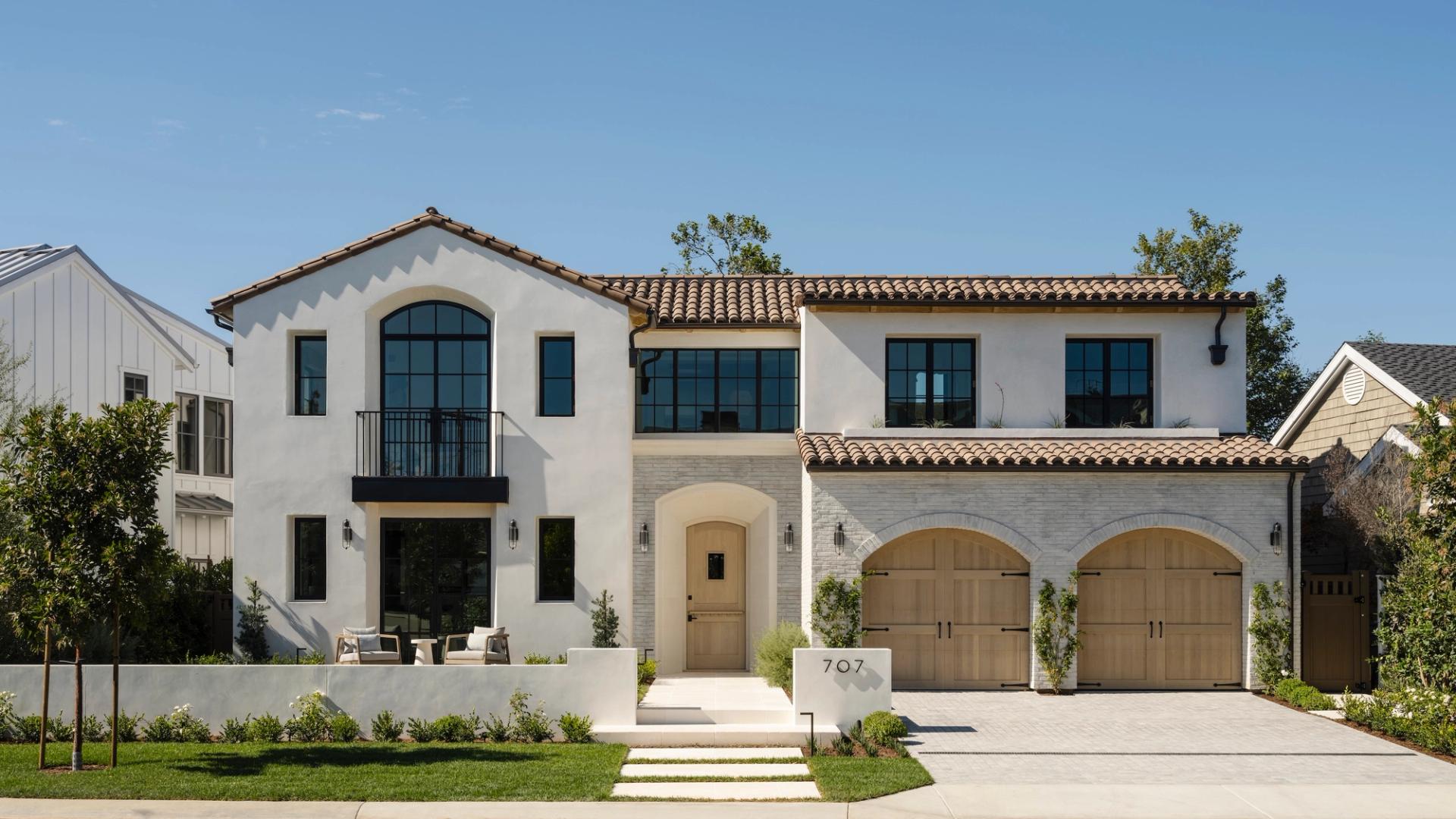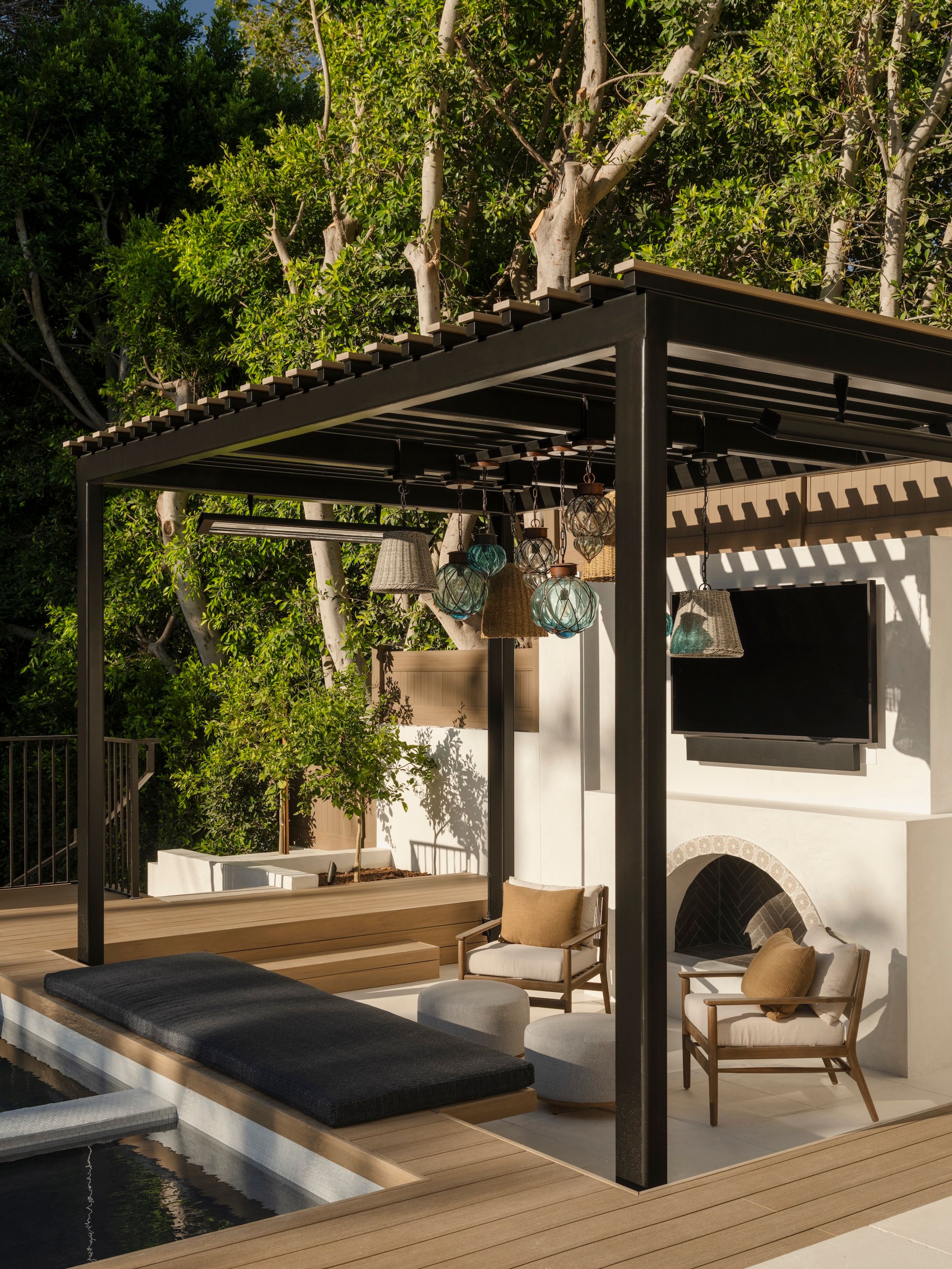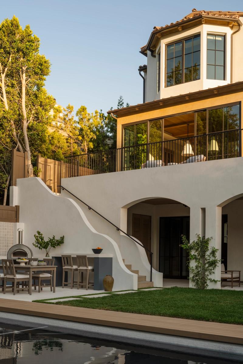 Spanish influences, a sunken, poolside fire pit, and warm wood details shape stylish spaces for gathering and celebration.