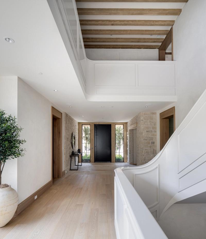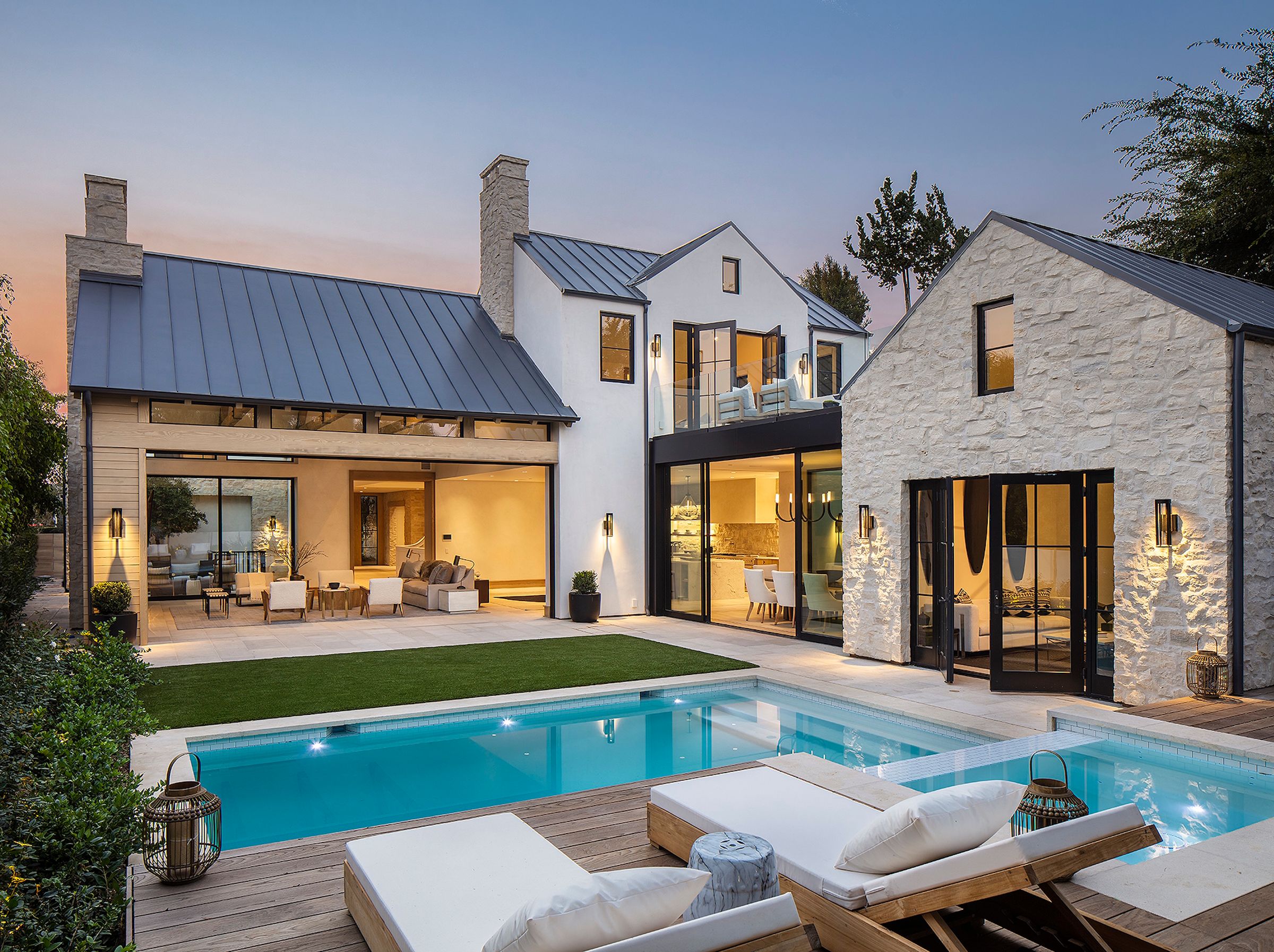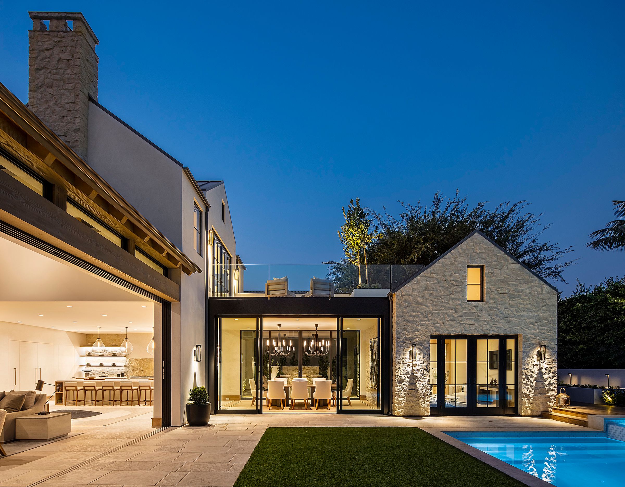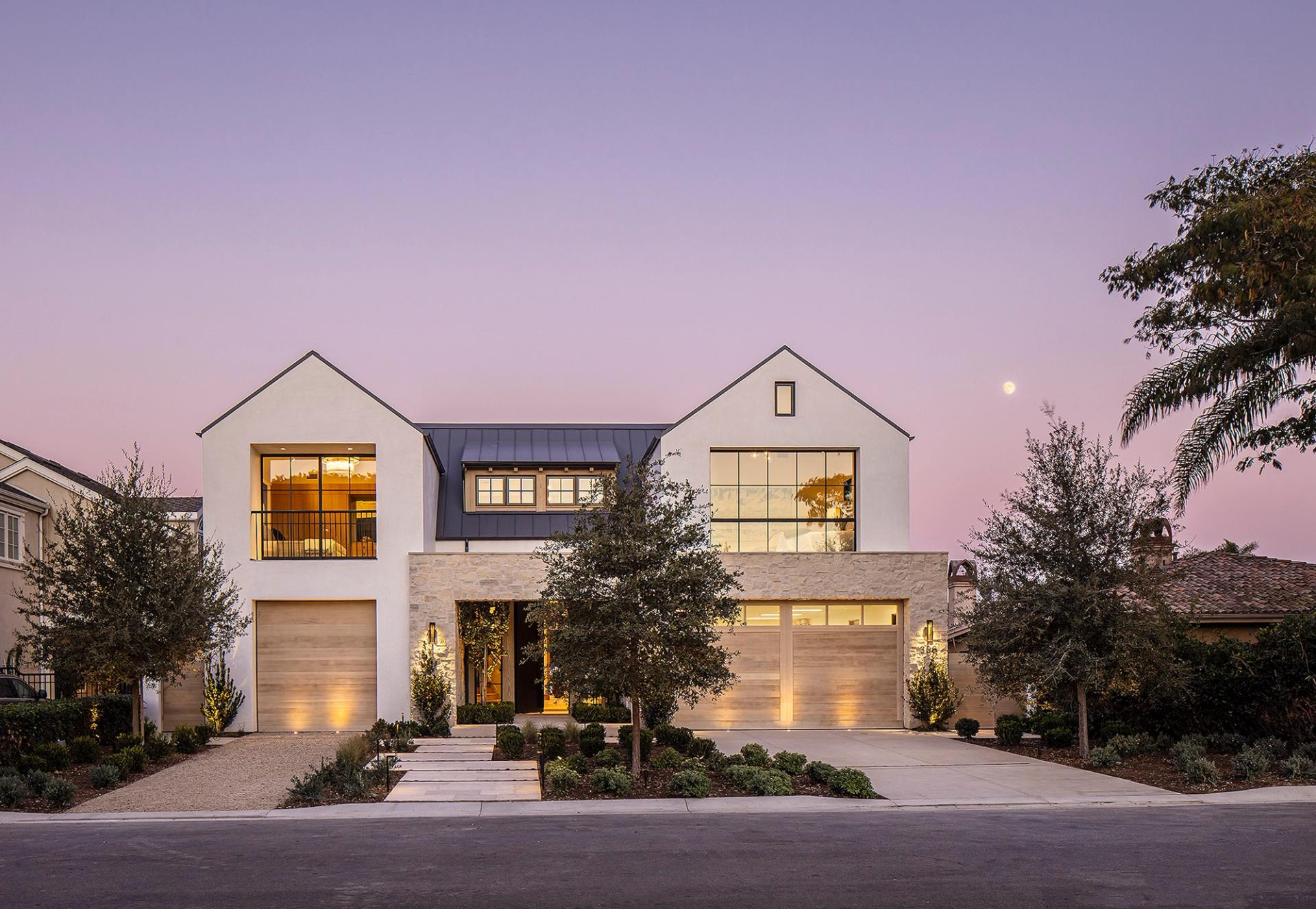 Natural stone and wood elements warm the home’s clean gables and simple massing.