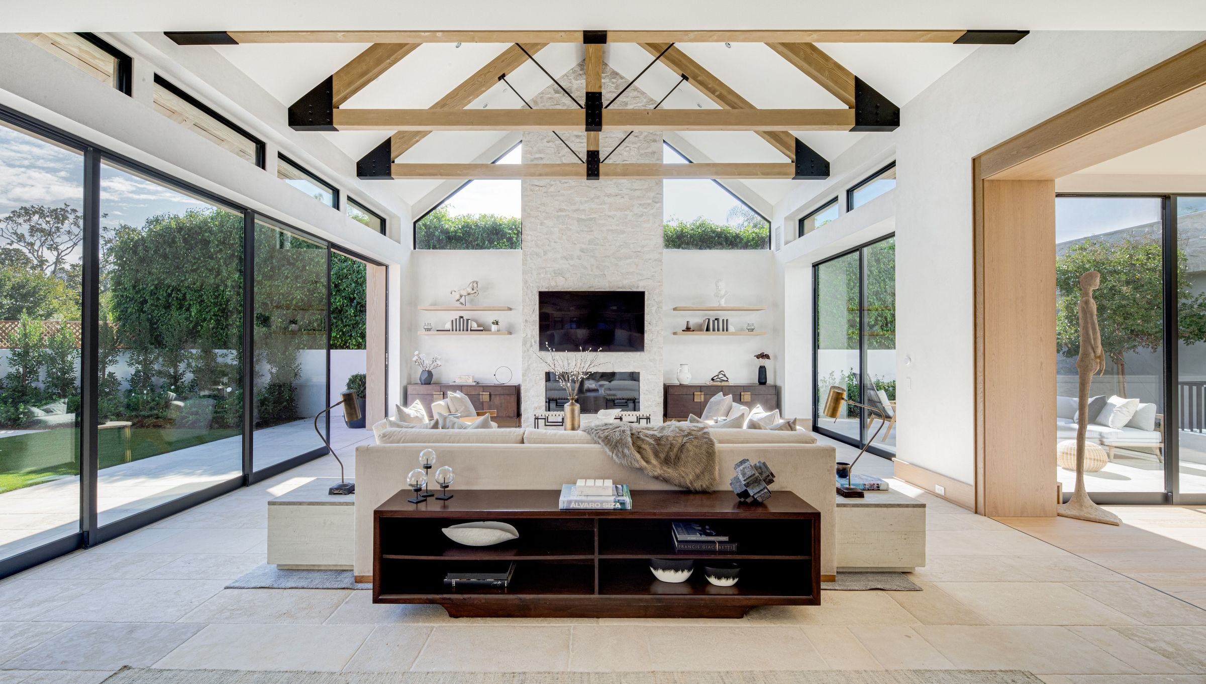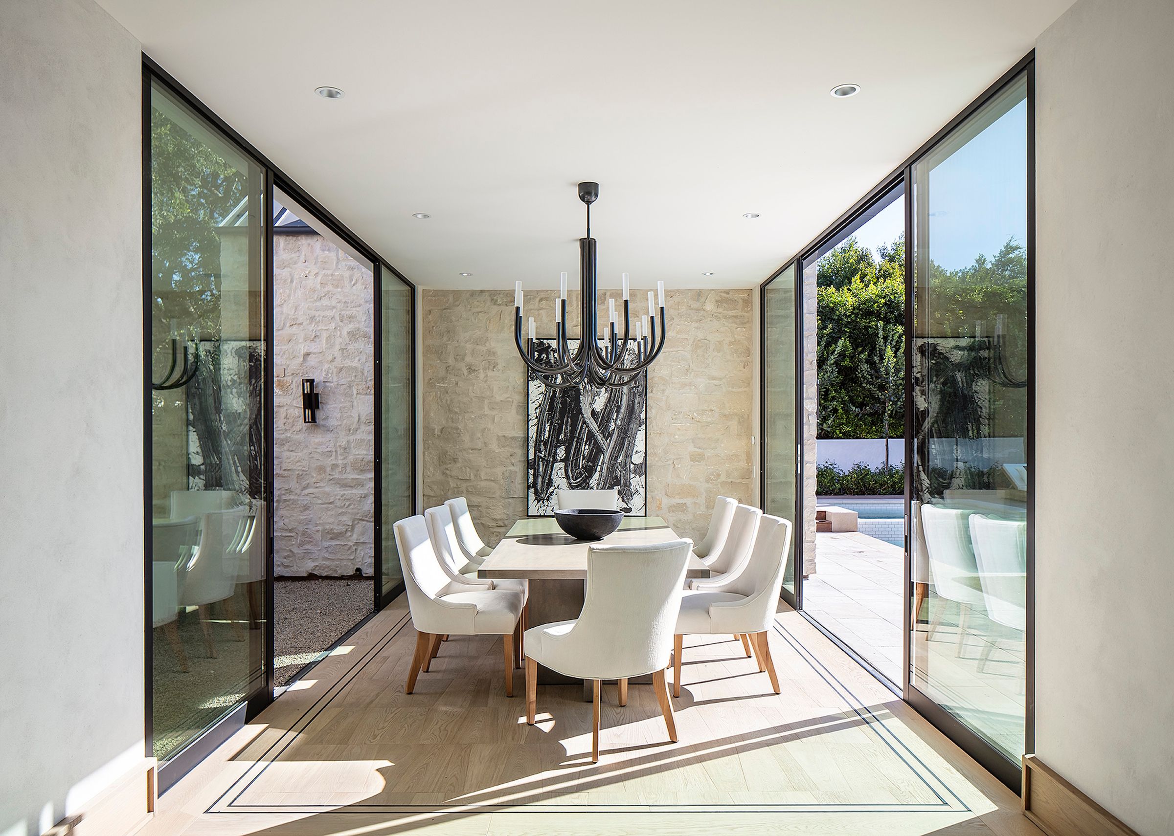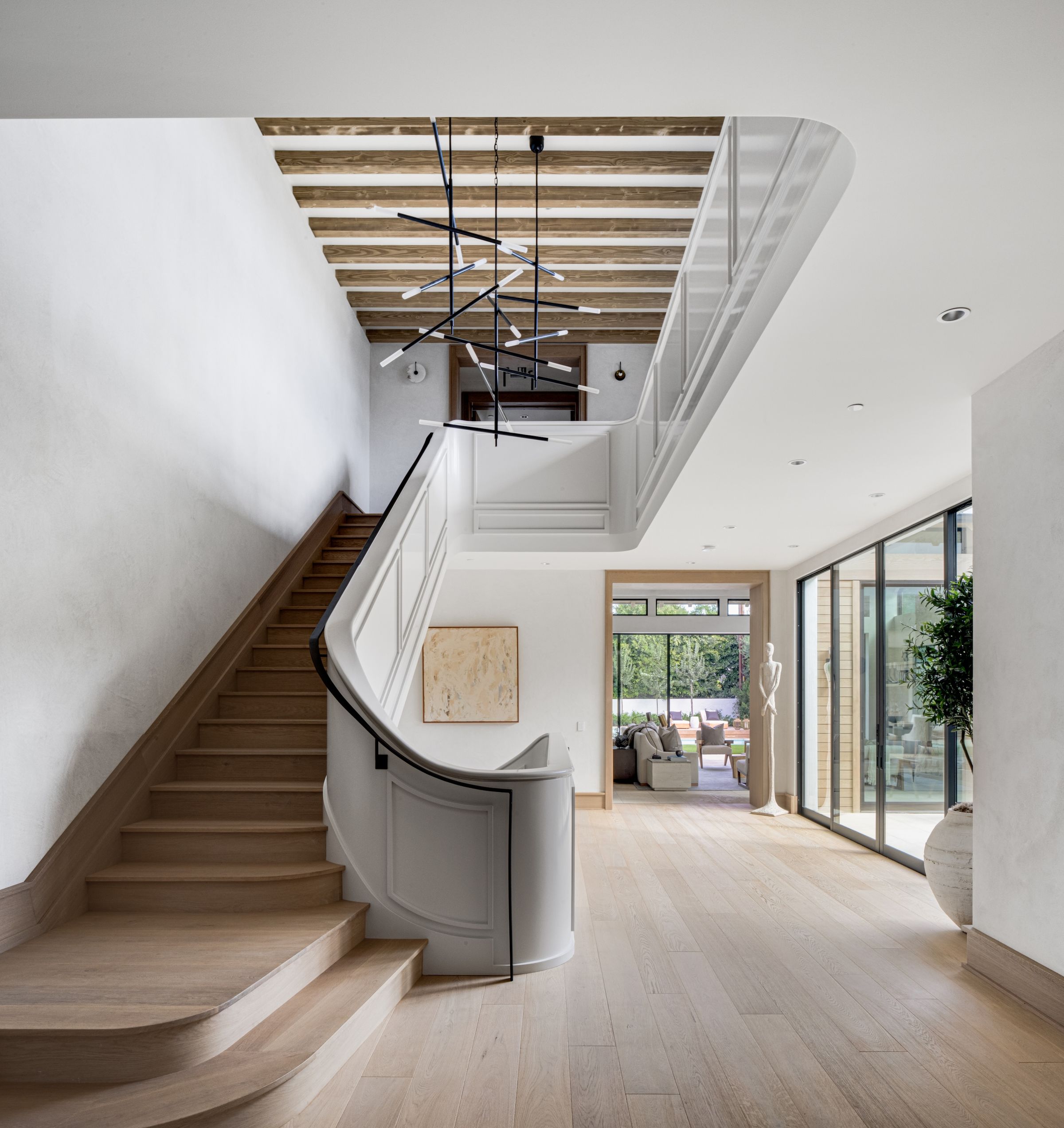 Natural stone and wood elements warm the home’s clean gables and simple massing.