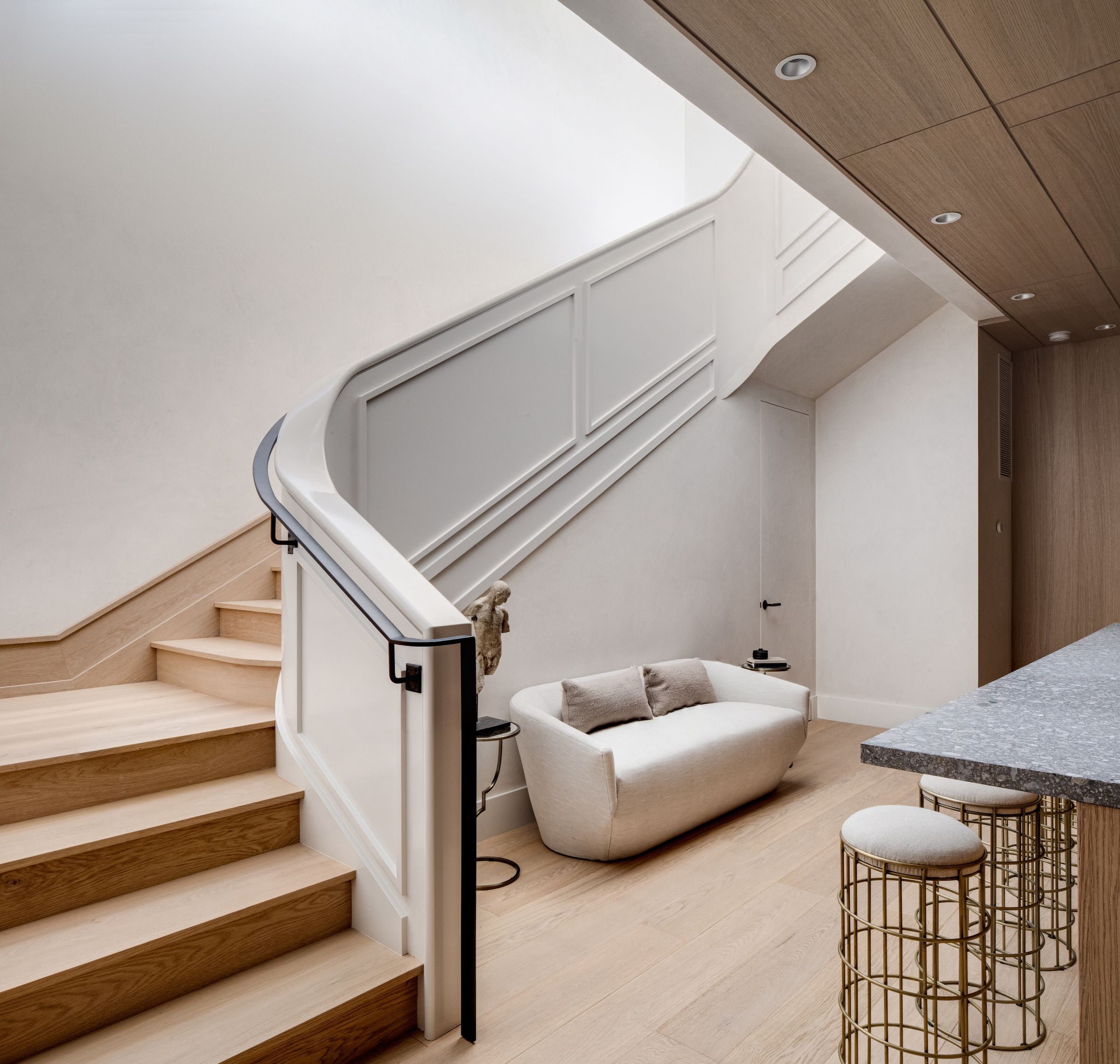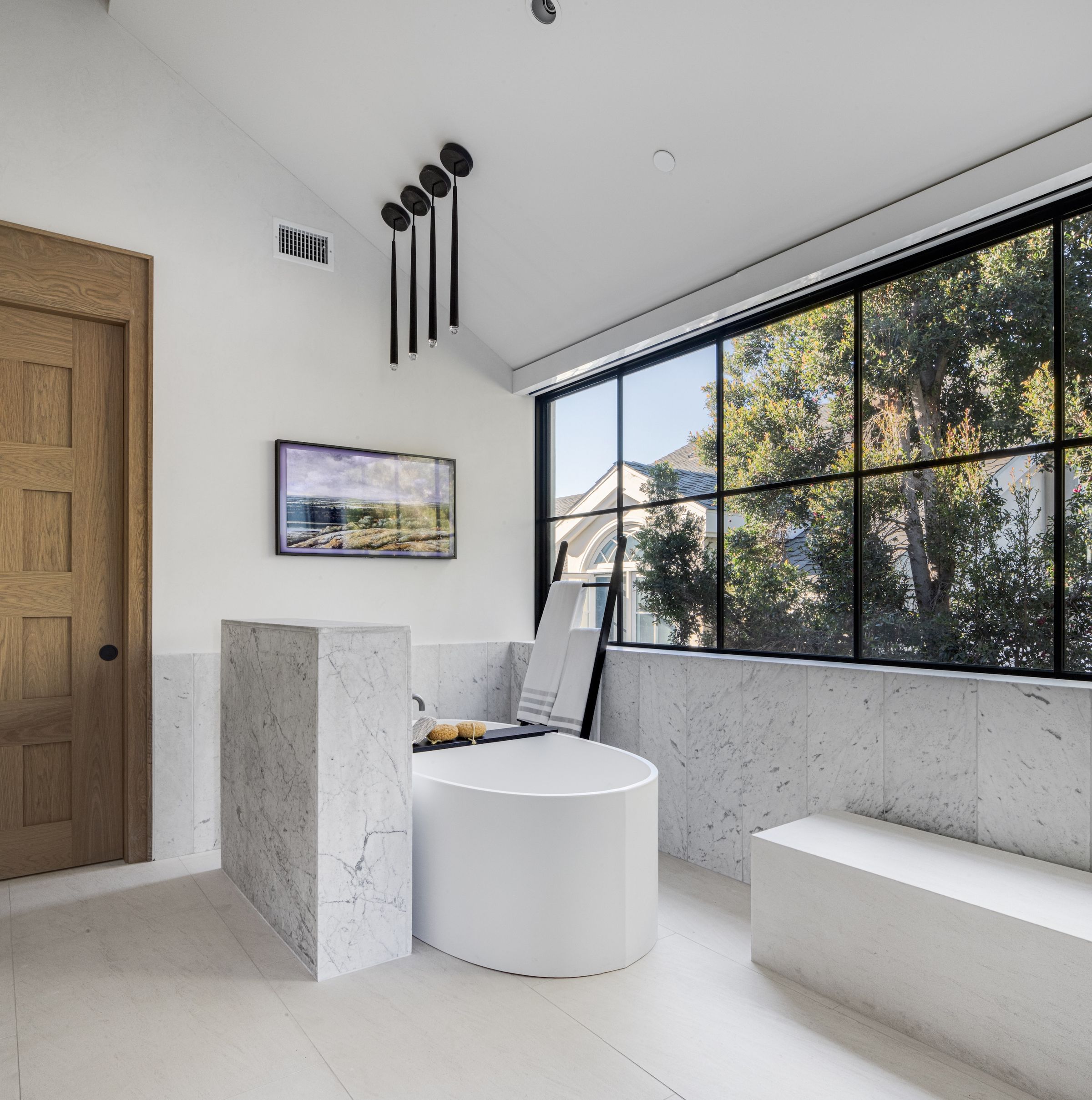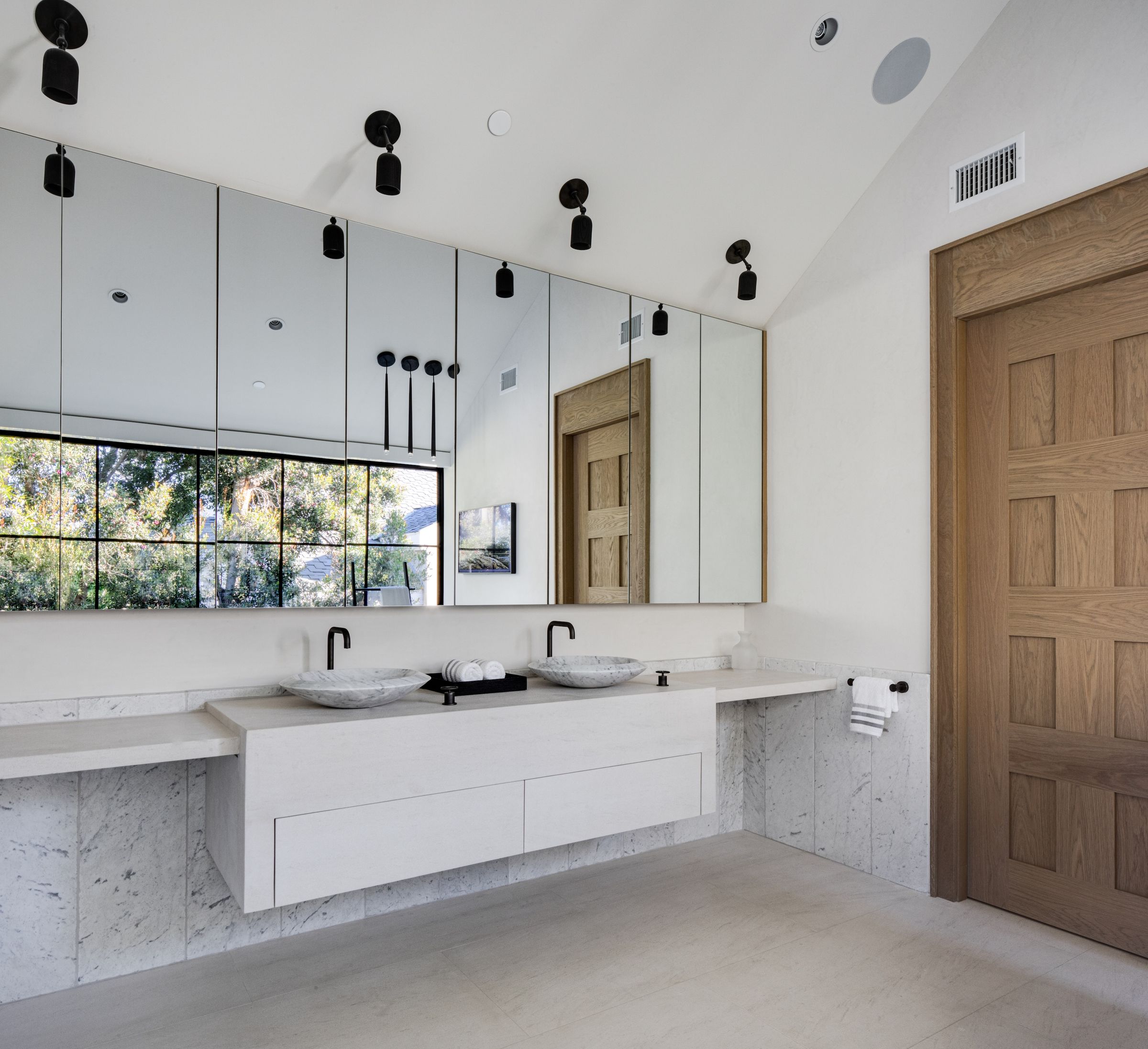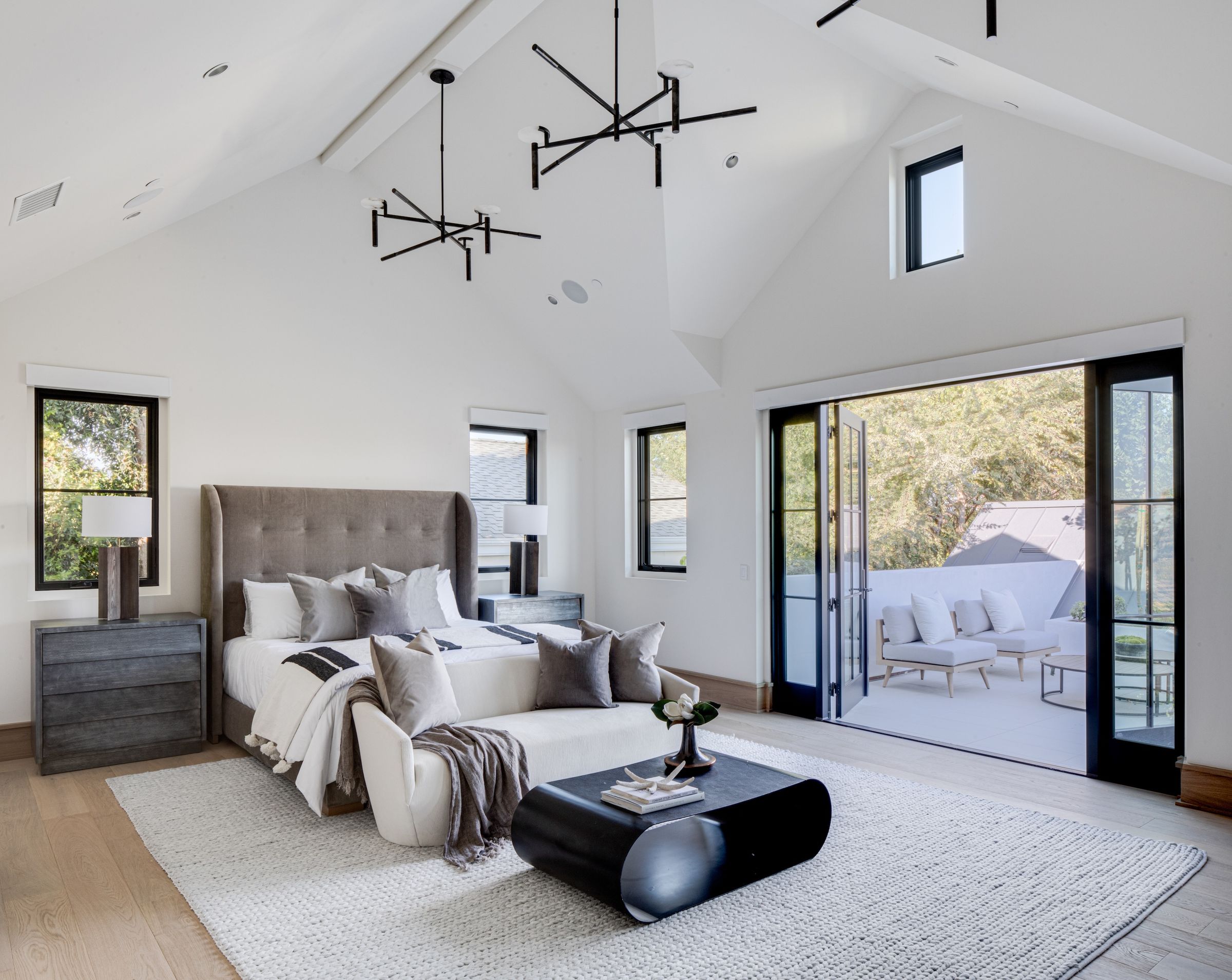 Natural stone and wood elements warm the home’s clean gables and simple massing.