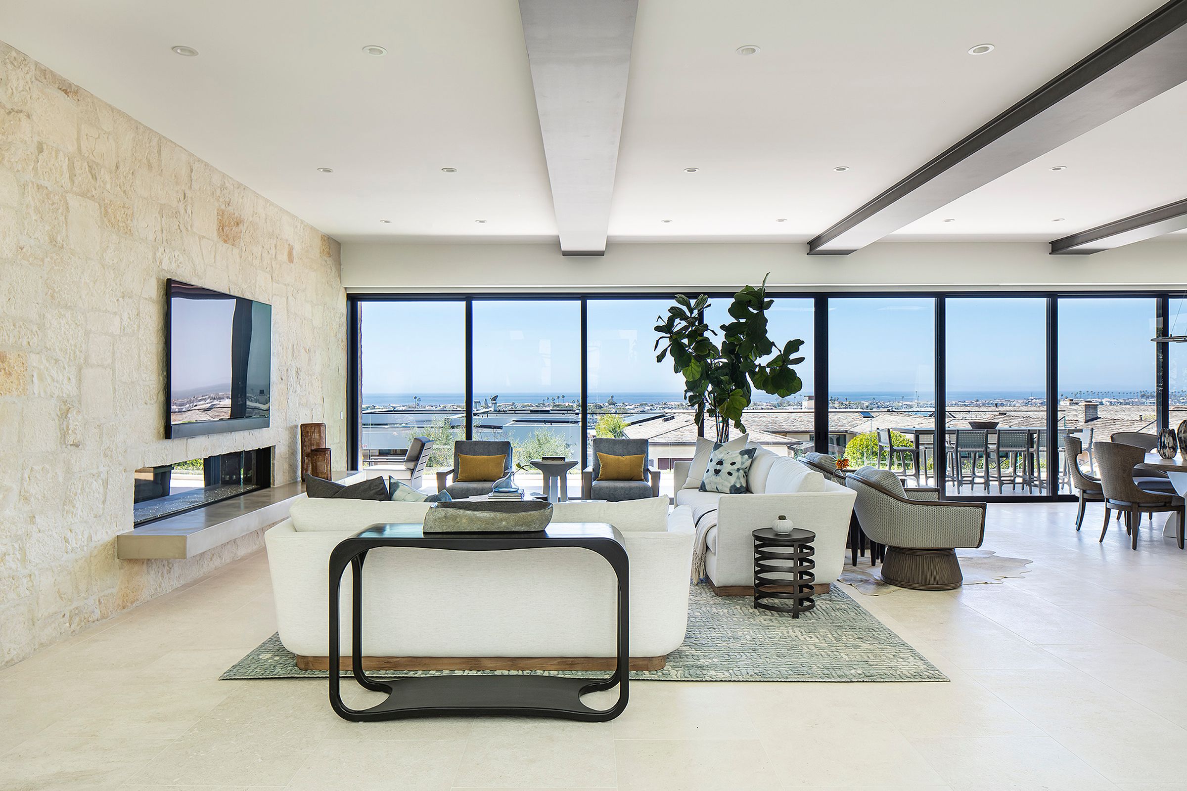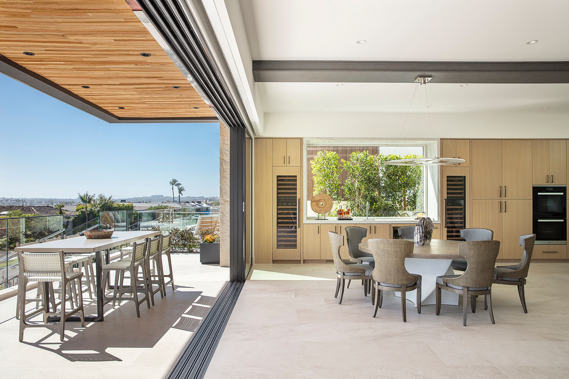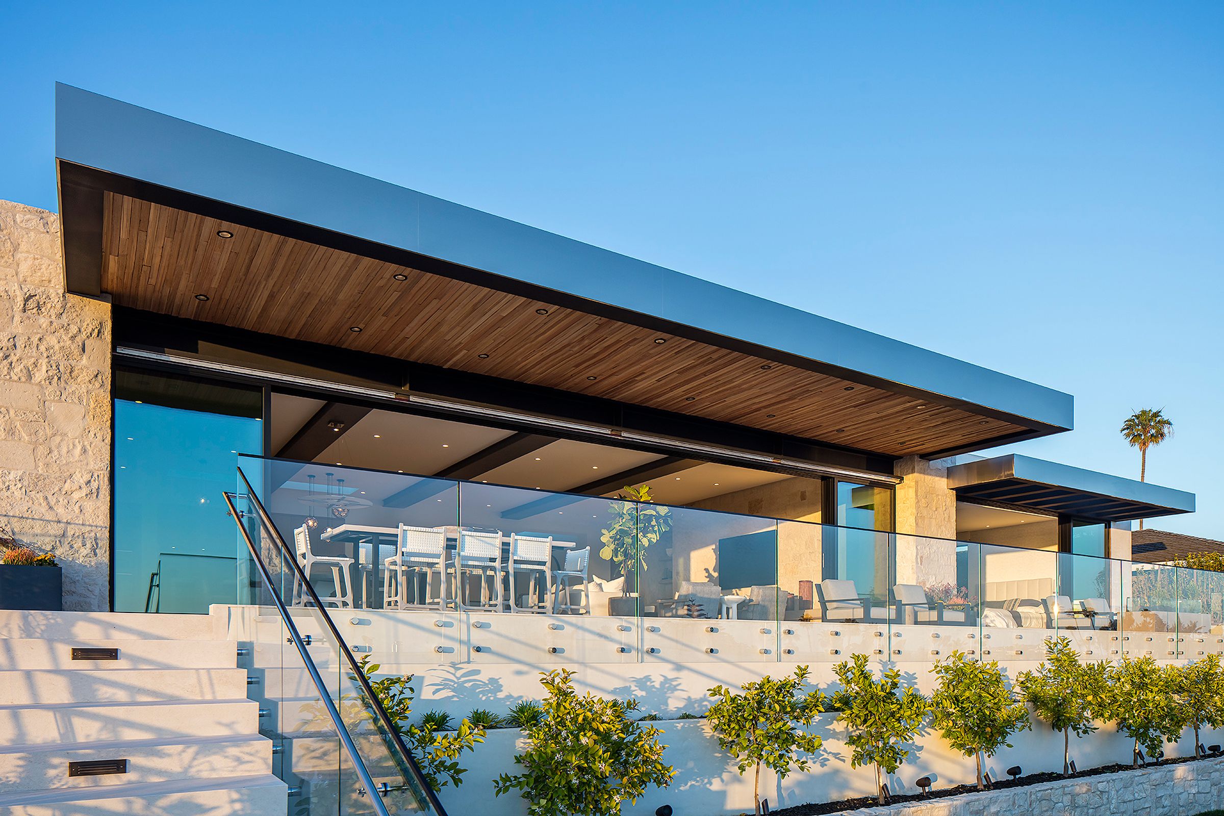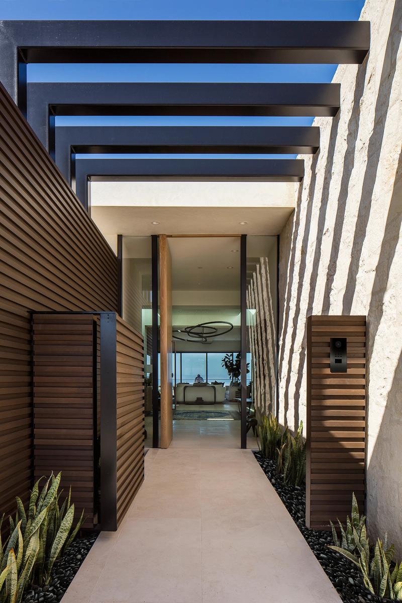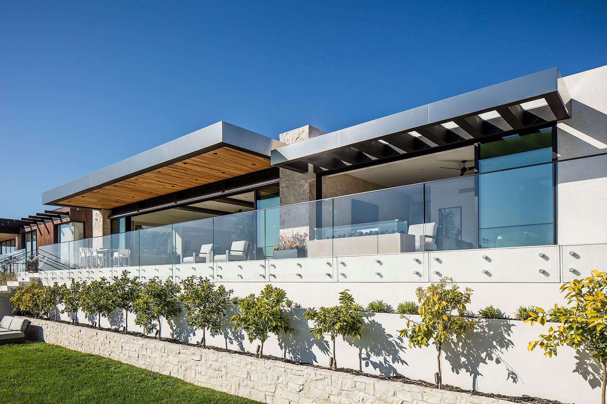 Large spans of glass, a cantilevered roof, and a metal trellis define this coastal home with rhythm and restraint.