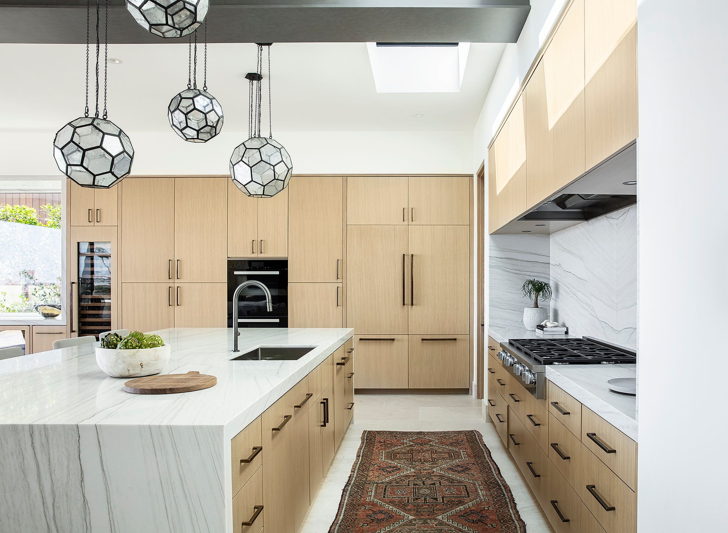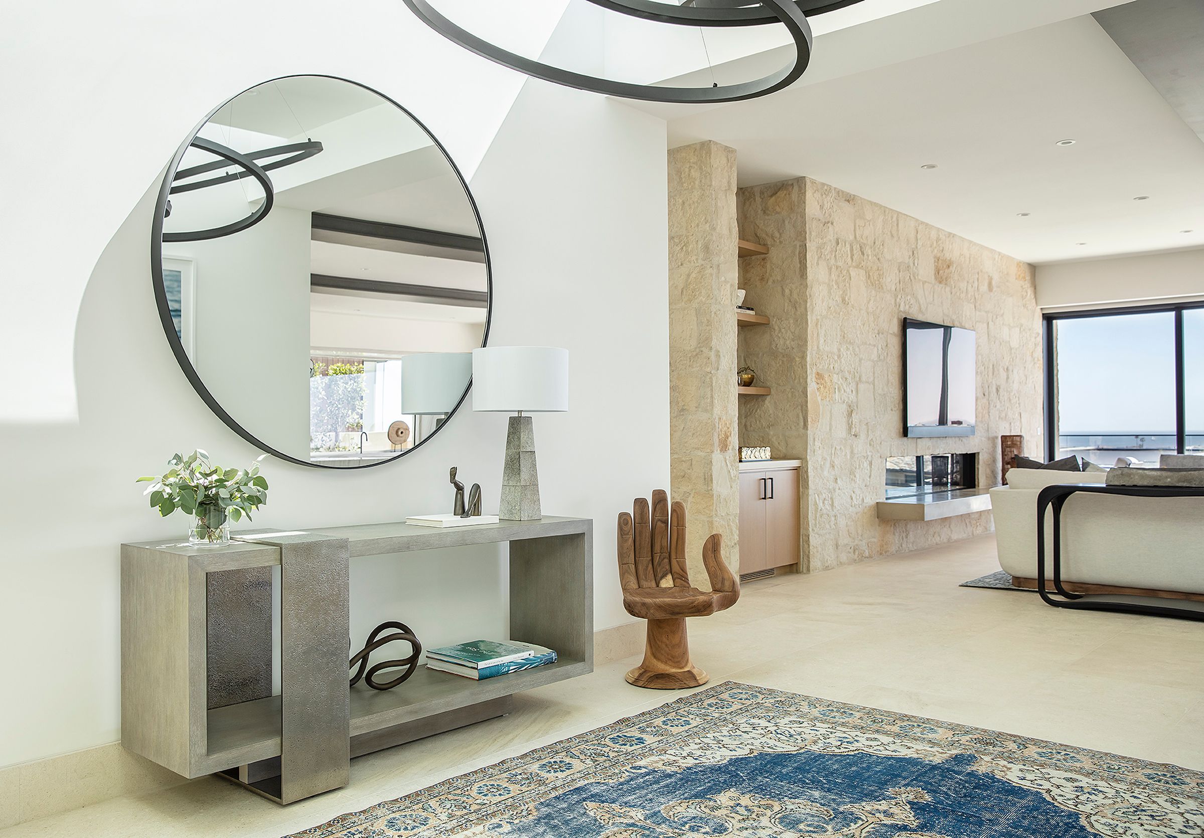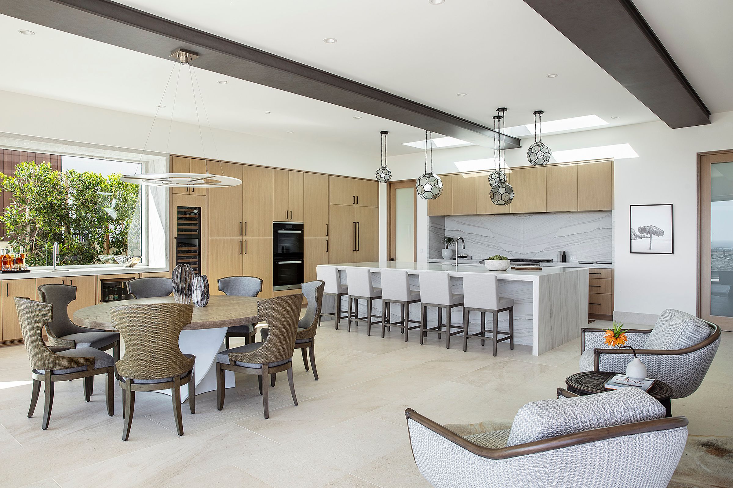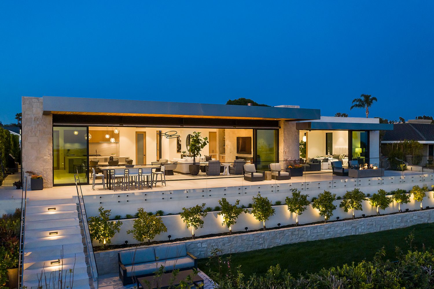 Large spans of glass, a cantilevered roof, and a metal trellis define this coastal home with rhythm and restraint.
