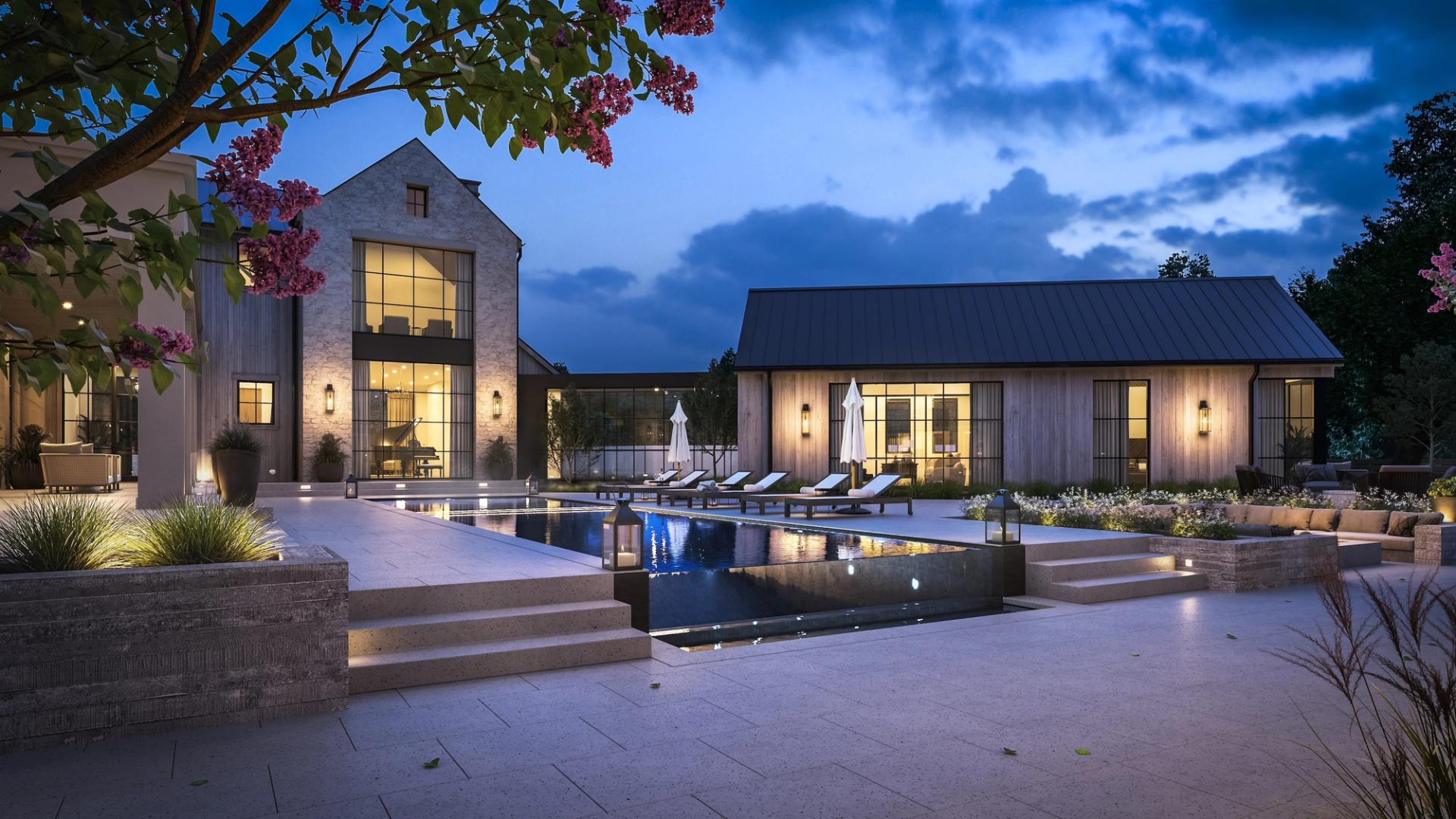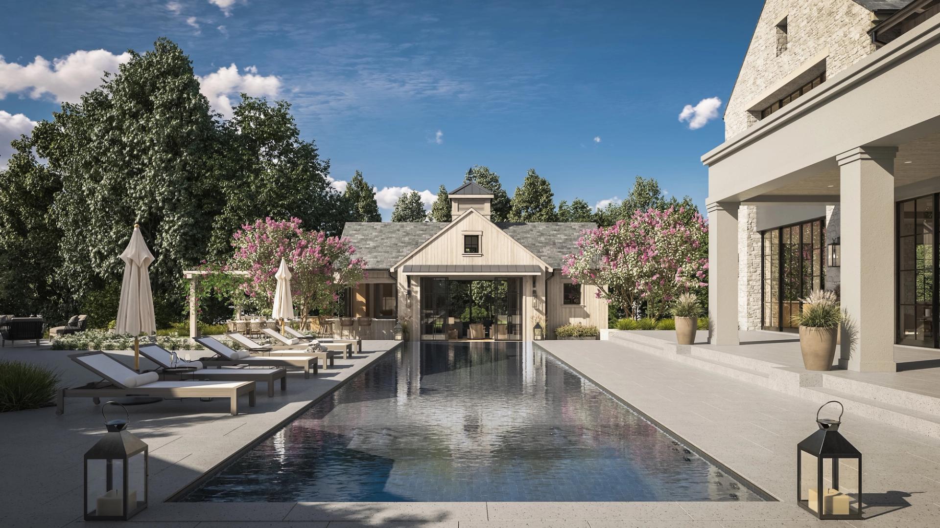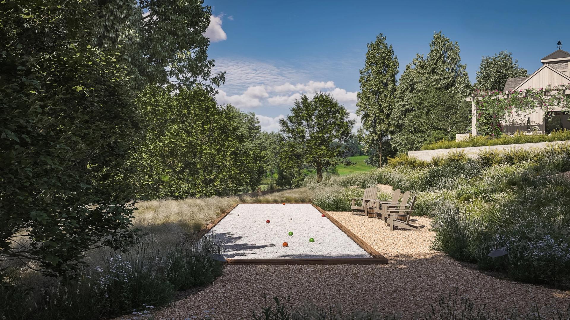 The Details: The development invites a rustic modern appeal designed to balance leisure and daily life, offering spaces for gathering with family and friends or enjoying quiet repose. Think sunken outdoor living room, a bocce ball pebble court, and a pool that swims up to a pavilion.